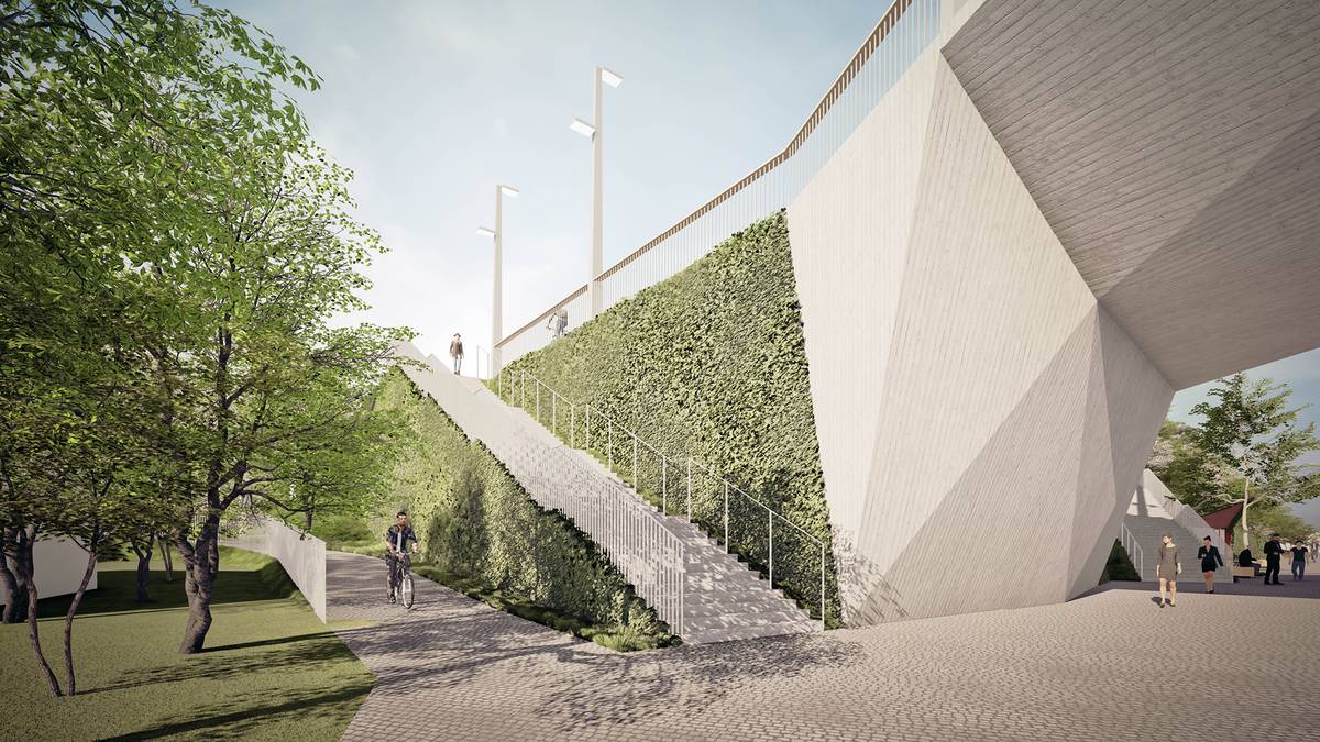 Cyklistická lávka a schodiště na zlíchovské straně. Parkové úpravy v okolí mostu navrhl krajinářský architekt Zdeněk Sendler (vizualizace).