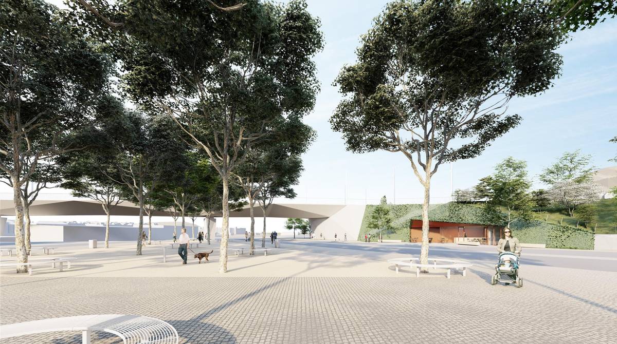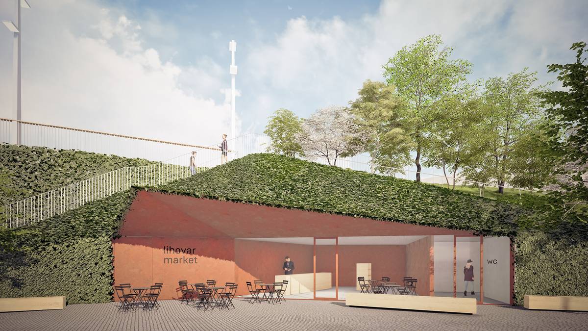 Nový veřejný prostor mezi mostem a obytnou zástavbou Lihovar (vizualizace).