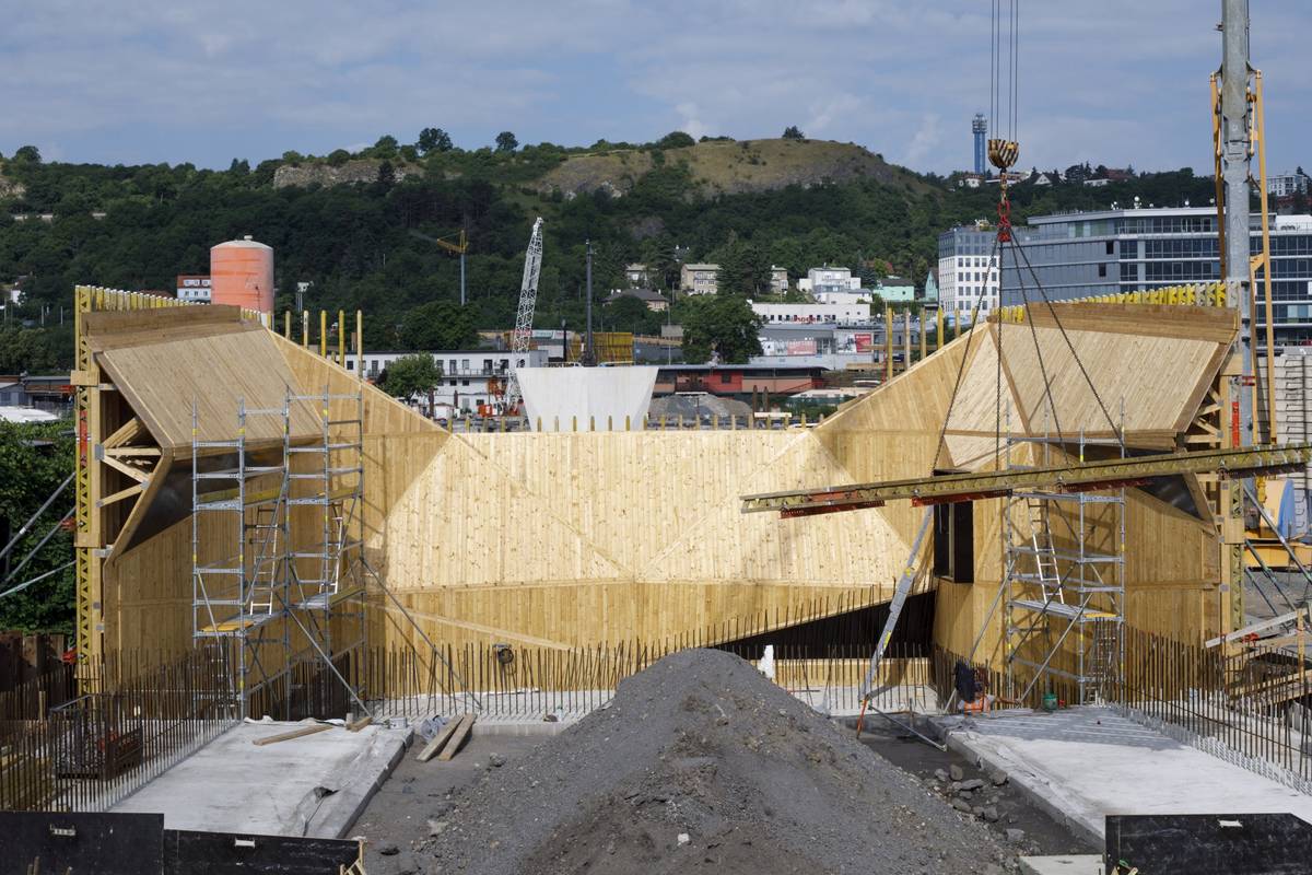 Součástí mostu u opěry na zlíchovské straně bude informační centrum Pražské integrované dopravy spolu s veřejnými záchody (vizualizace).