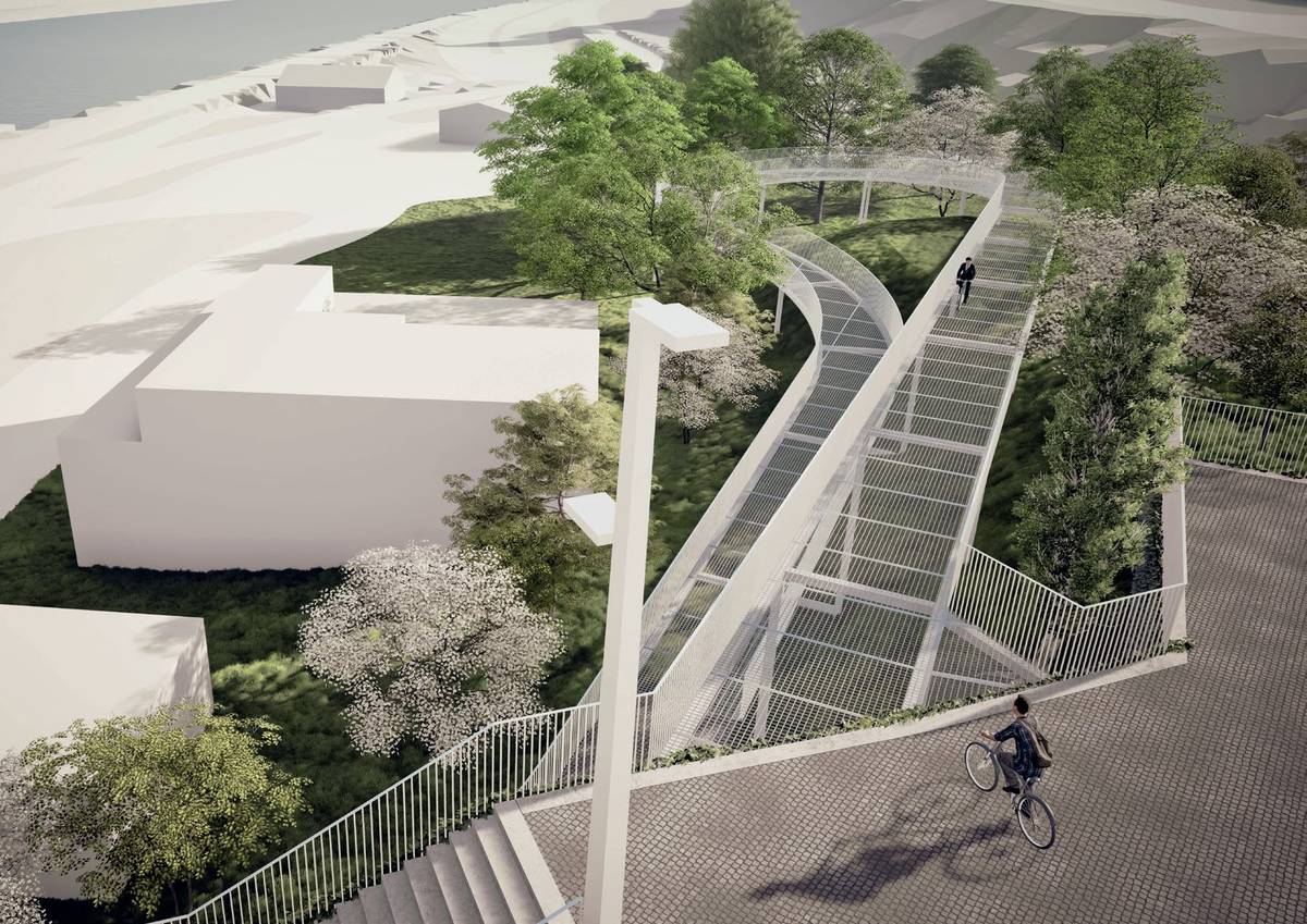 Na zlíchovské straně budou schodiště včleněná do terénu a doplněná popínavou zelení (vizualizace).