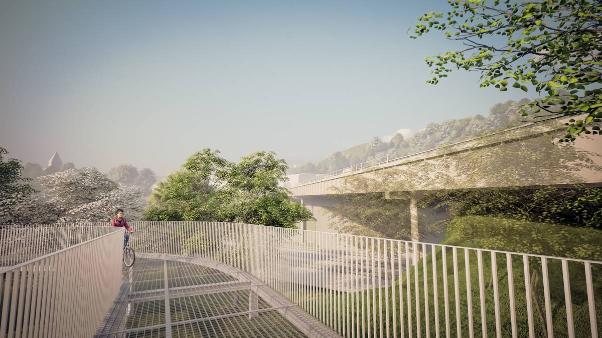 Na zlíchovské straně bude smyčka cyklistické lávky (vizualizace).