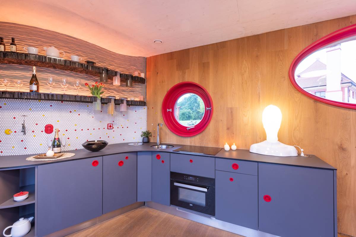 Oválný „hausbót“ poskytuje obytnou plochu 43 metrů čtverečních a k dispozici má 2+kk.