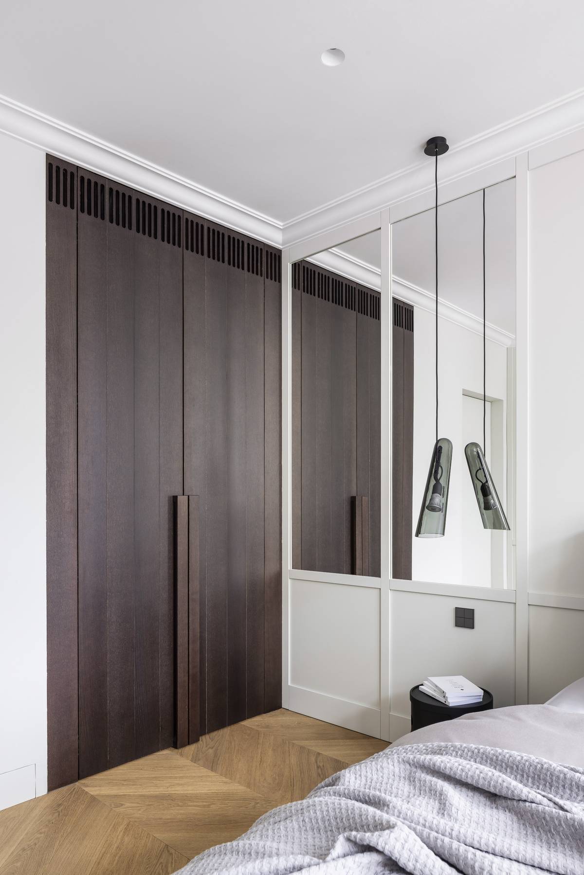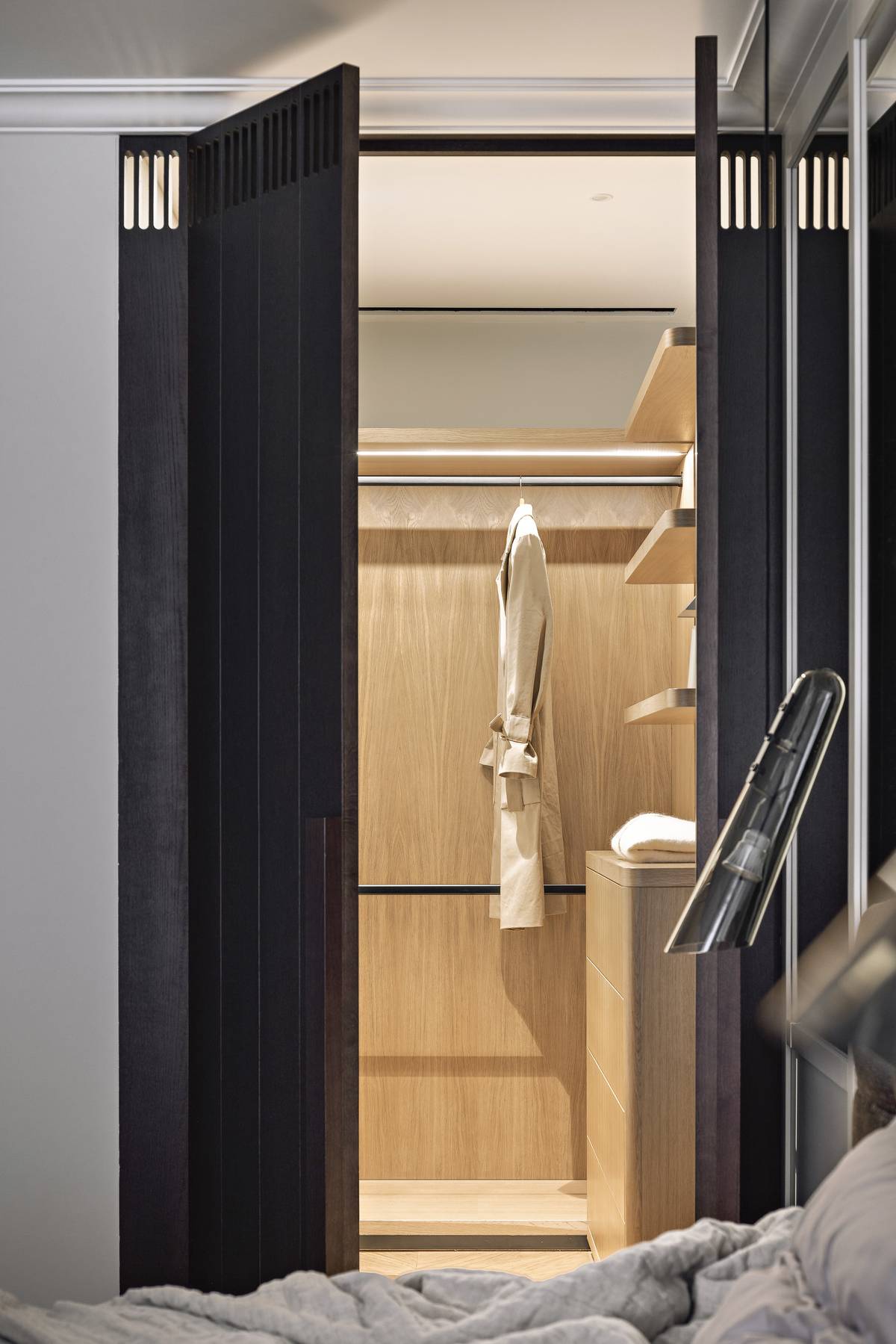 Byt má i svá malá tajemství. Například v ložnici rodičů se za vysokými dveřmi z tmavě mořeného dubu skrývá nikoli skříň, ale rovnou šatna.