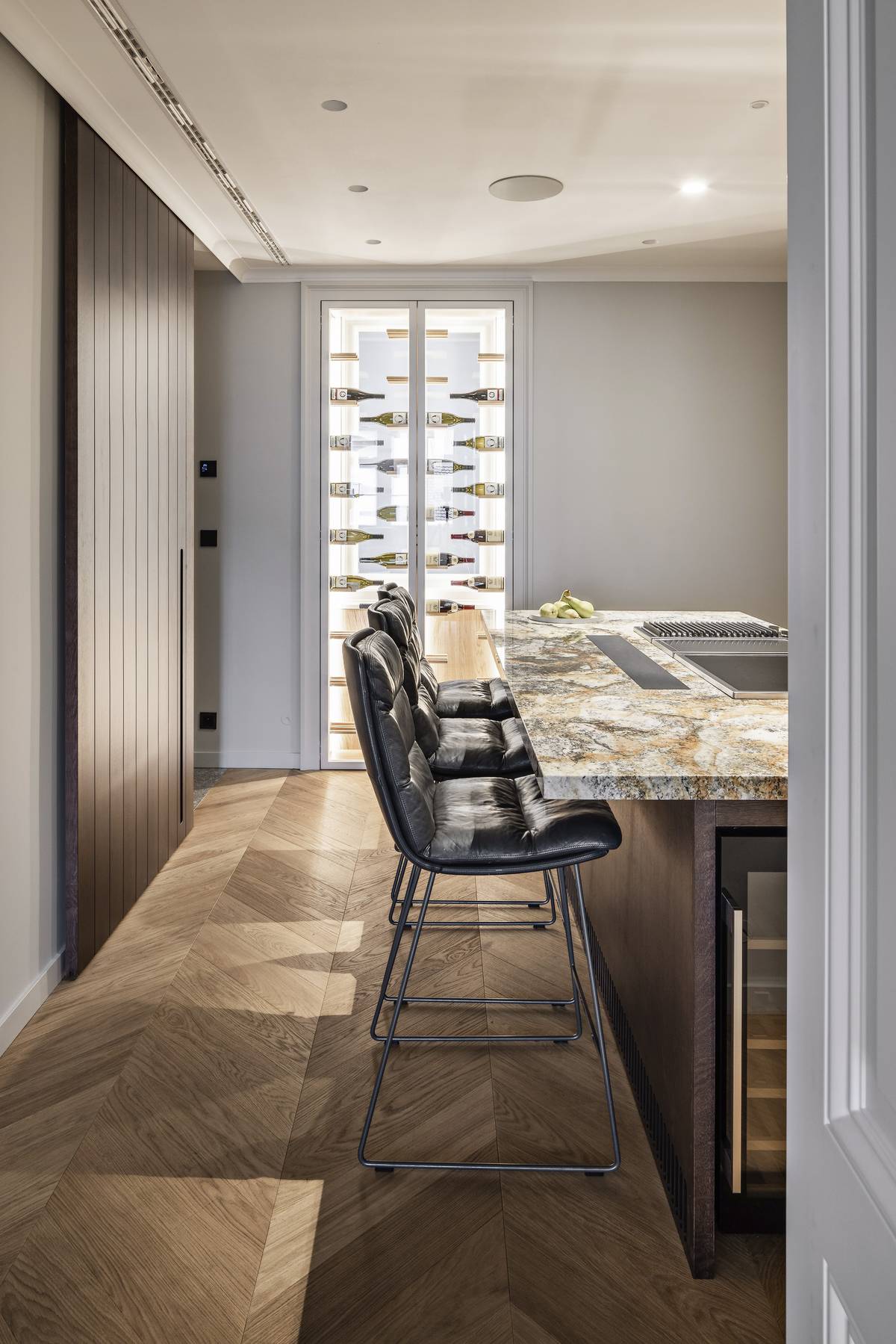 Mezi úložnými prostory v bytě nemohla chybět ani velkorysá vinotéka s výškou od země ke stropu.