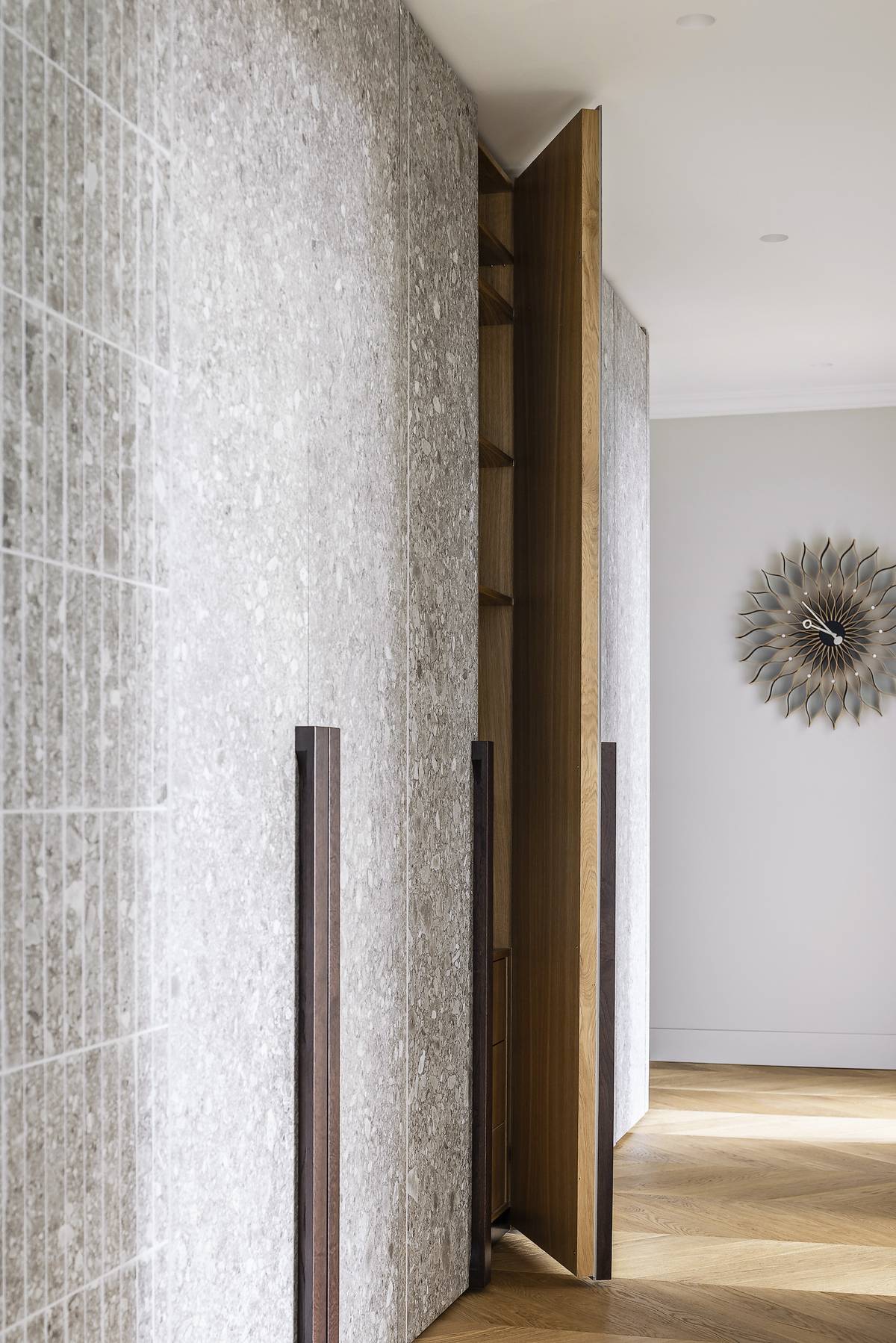 Obklady použité v koupelnách architekti uplatnili také například v chodbě.