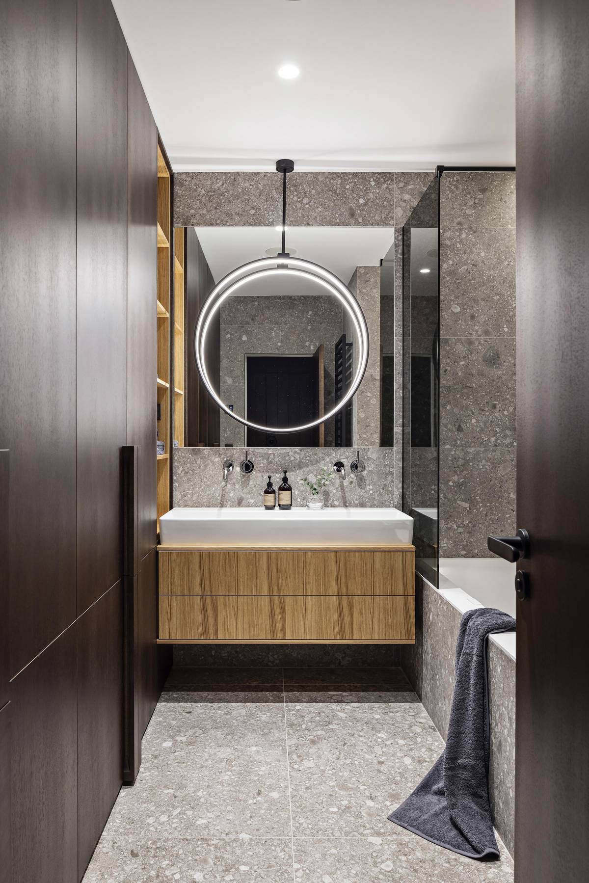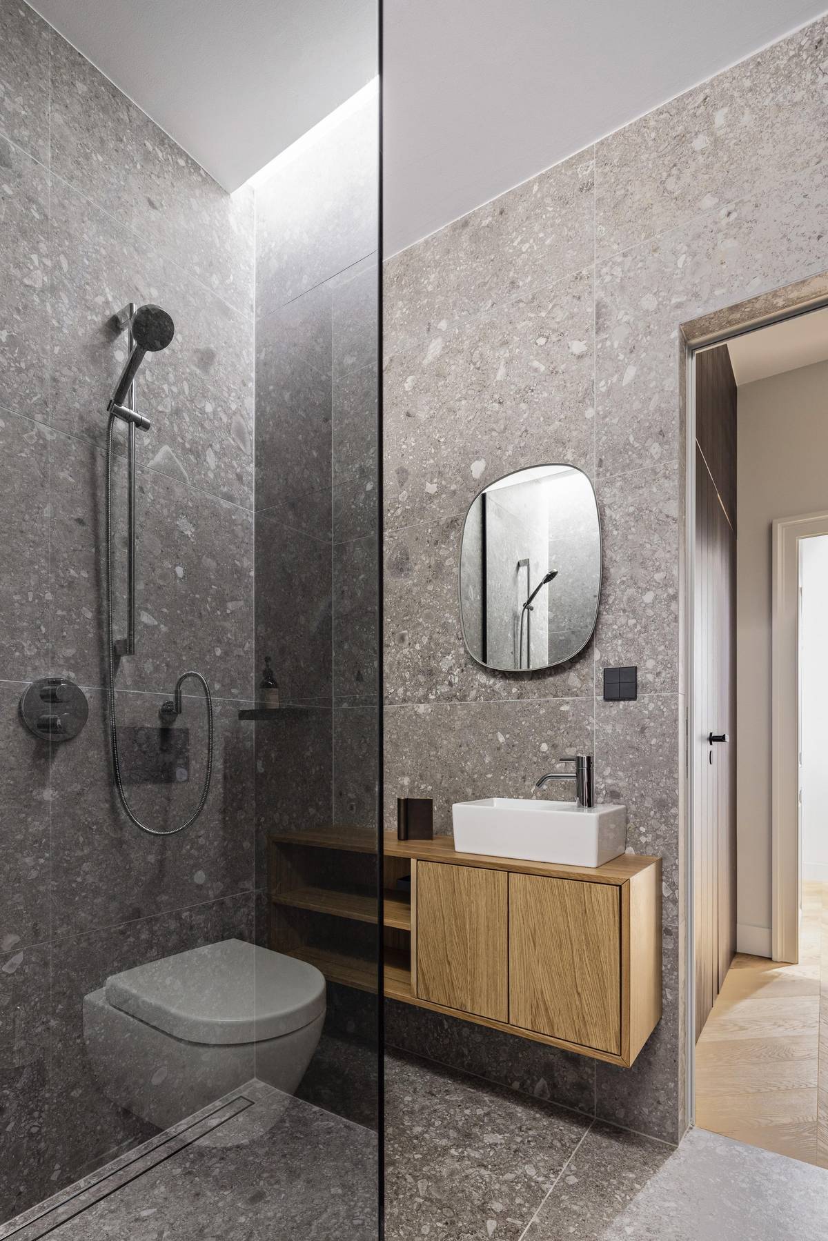 Obklady z křemene doplňuje v koupelnách atypický nábytek z přírodního a tmavě mořeného dubu.