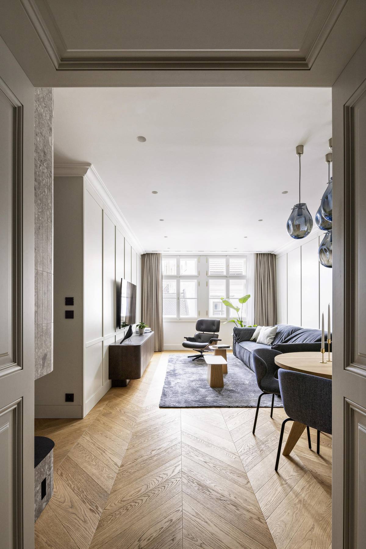 Celý interiér je jako scéna složená z luxusních materiálů, které jsou citlivě vybrány tak, aby nechaly zazářit designové solitéry.