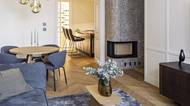 Svítidlo ve tvaru mýdlových bublinek vytváří hezký kontrast s krbem.