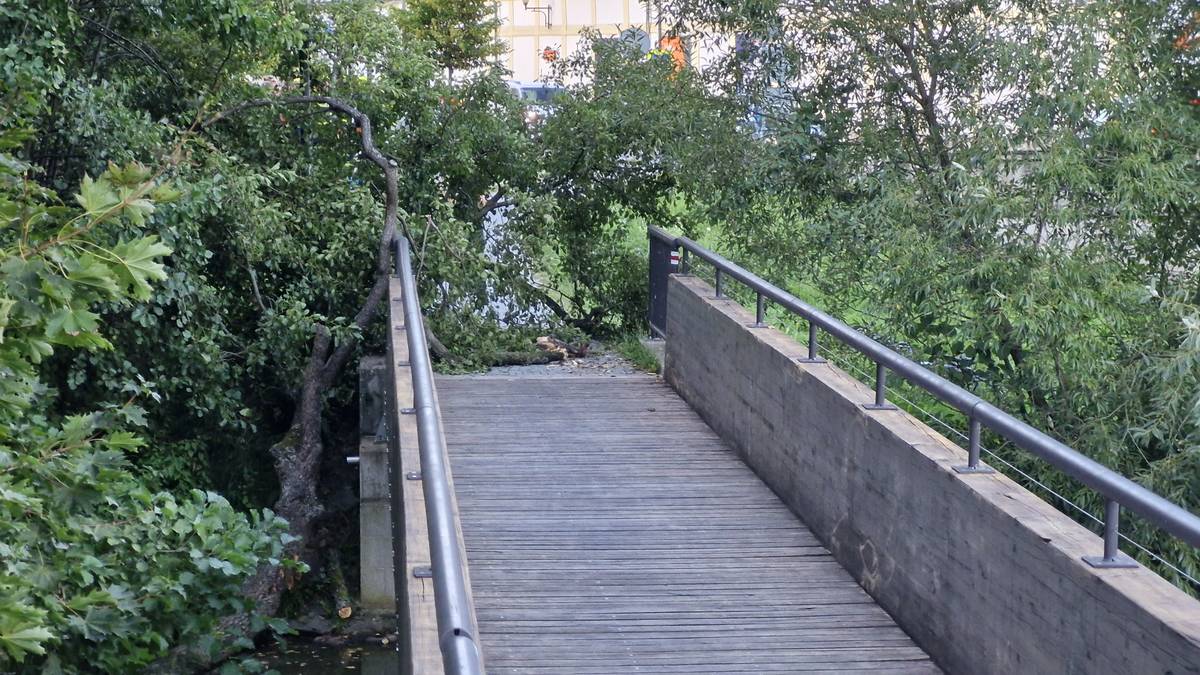 V historické části Žďáru nad Sázavou spadl strom a zranil cyklistu. Lávka pro pěší u barokního mostu je zavřená.