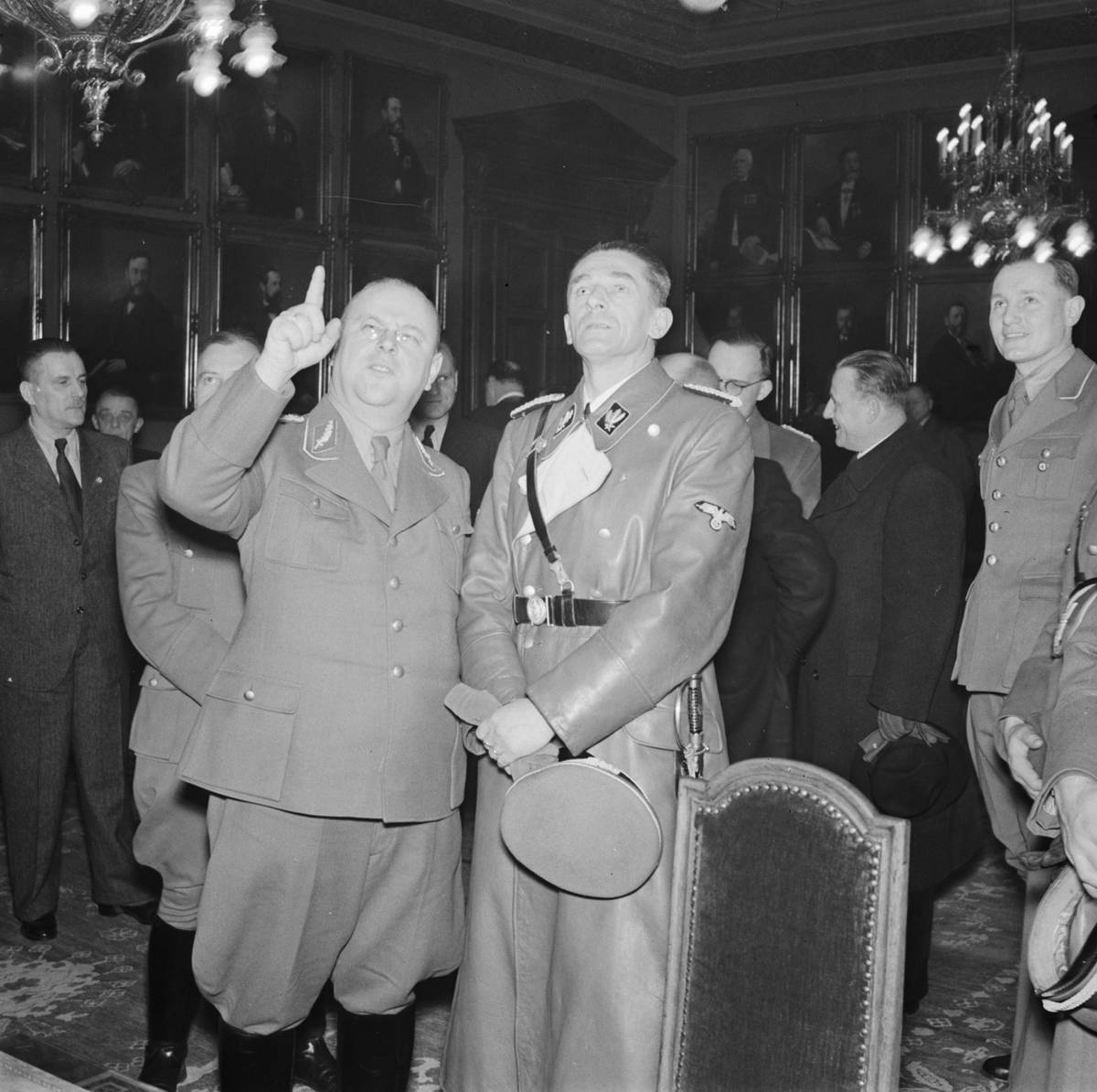 Státní tajemník v Úřadu říšského protektora, SS-Gruppenführer Karl H. Frank (uprostřed), při návštěvě Staroměstské radnice, Staroměstské náměstí, Praha, 9. prosinec 1939. Výkladem jej doprovází náměstek primátora hl. m. Prahy, SA-Standartenführer Josef Pfitzner.