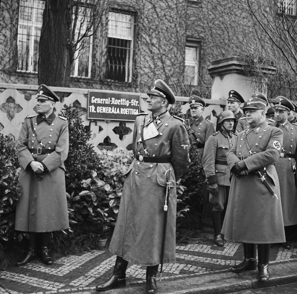 Slavnostní přejmenování Pelléovy ulice na Třídu generála Roettiga, Praha, 4. duben 1940. Uprostřed státní tajemník v Úřadu říšského protektora, SS-Gruppenführer Karl H. Frank, vpravo náměstek primátora, SA-Standartenführer Josef Pfitzner