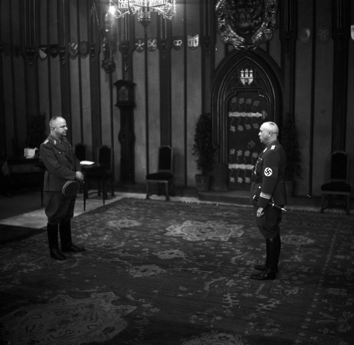 Náměstek primátora hl. m Prahy, SA-Standartenführer Josef Pfitzner při uvítání šéfa štábu SA Wilhelma Schepmanna, Staroměstská radnice, Praha, 24. září 1943