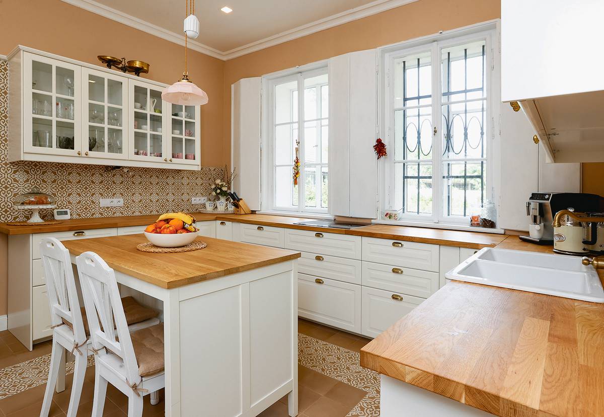 Kuchyň je prakticky uspořádaná do písmene U s centrálním ostrůvkem