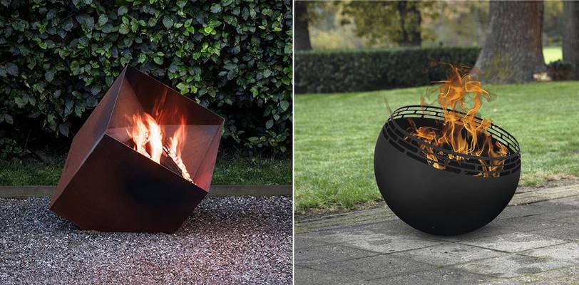 Zleva: Celoroční designové ohniště z oceli Eva Solo, 14 300 Kč, prodává Esklo; kulaté designové ohniště z kovu, 9 990 Kč, prodává Hornbach
