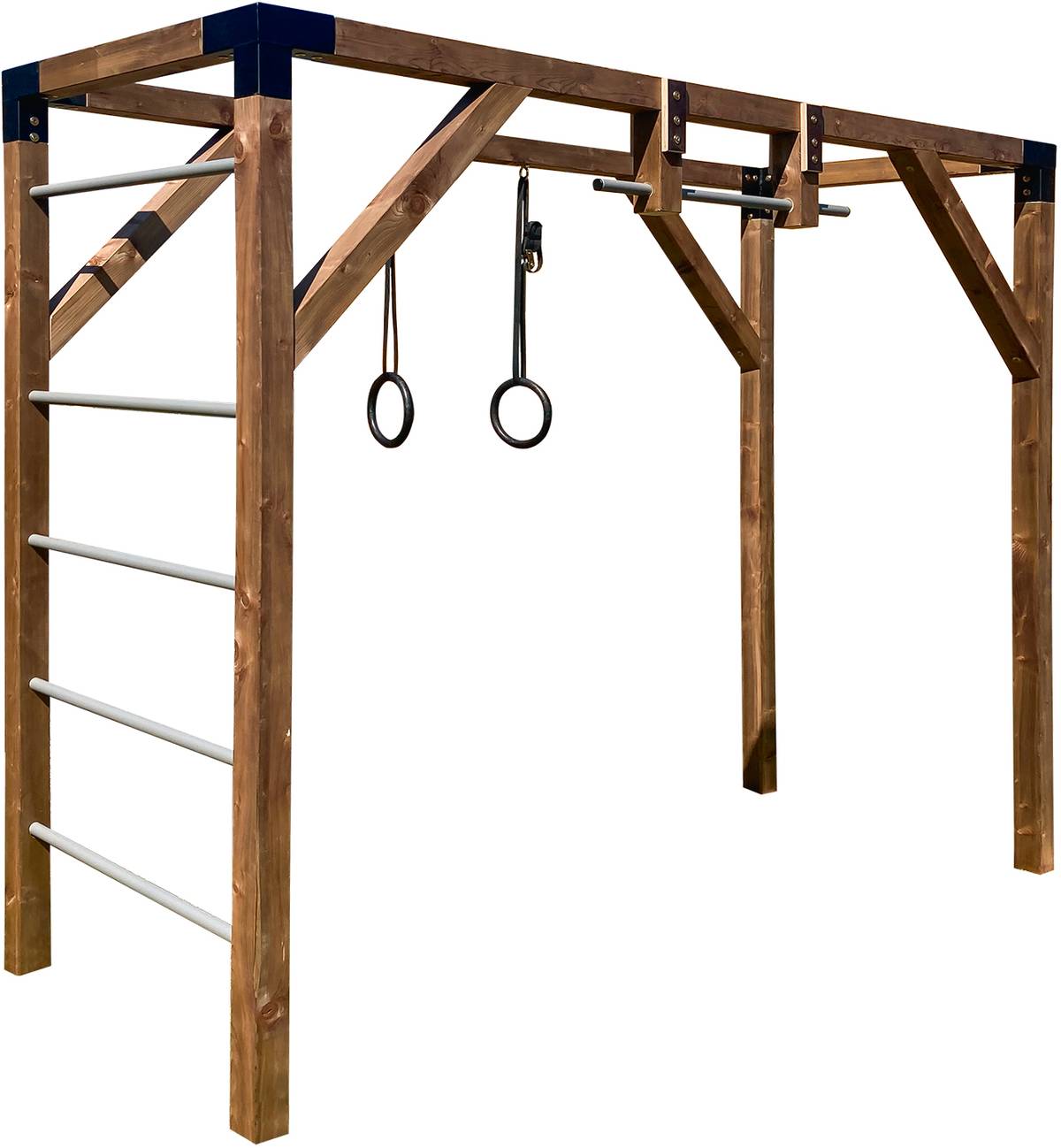 Variabilita hřišť je bohatší, než si mnozí možná myslí. Workoutovou konstrukci můžete využít jako žebřiny či hrazdu, pro děti na ni přidejte houpačku. Na snímku je dřevěný monkey bar za 39 800 Kč.