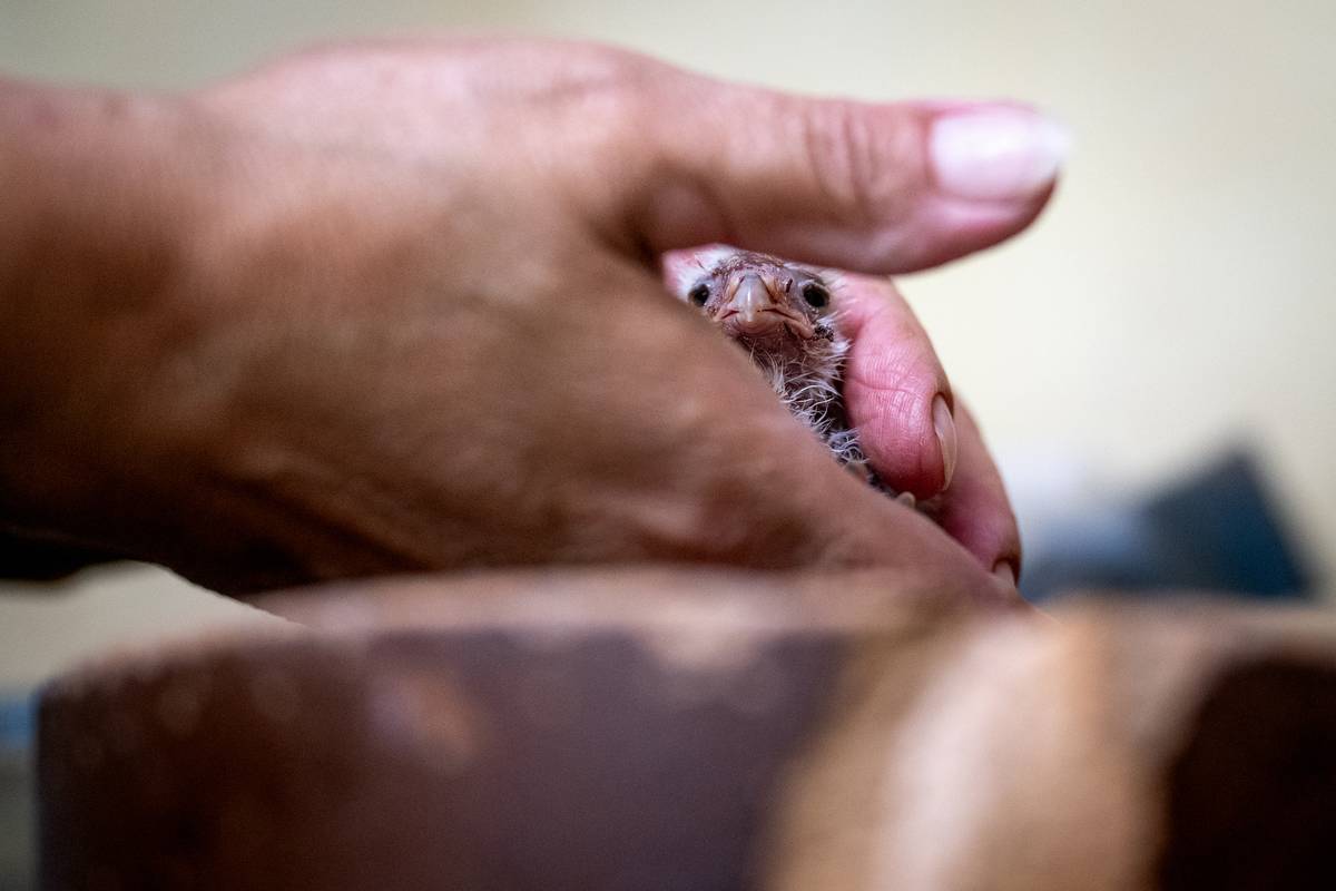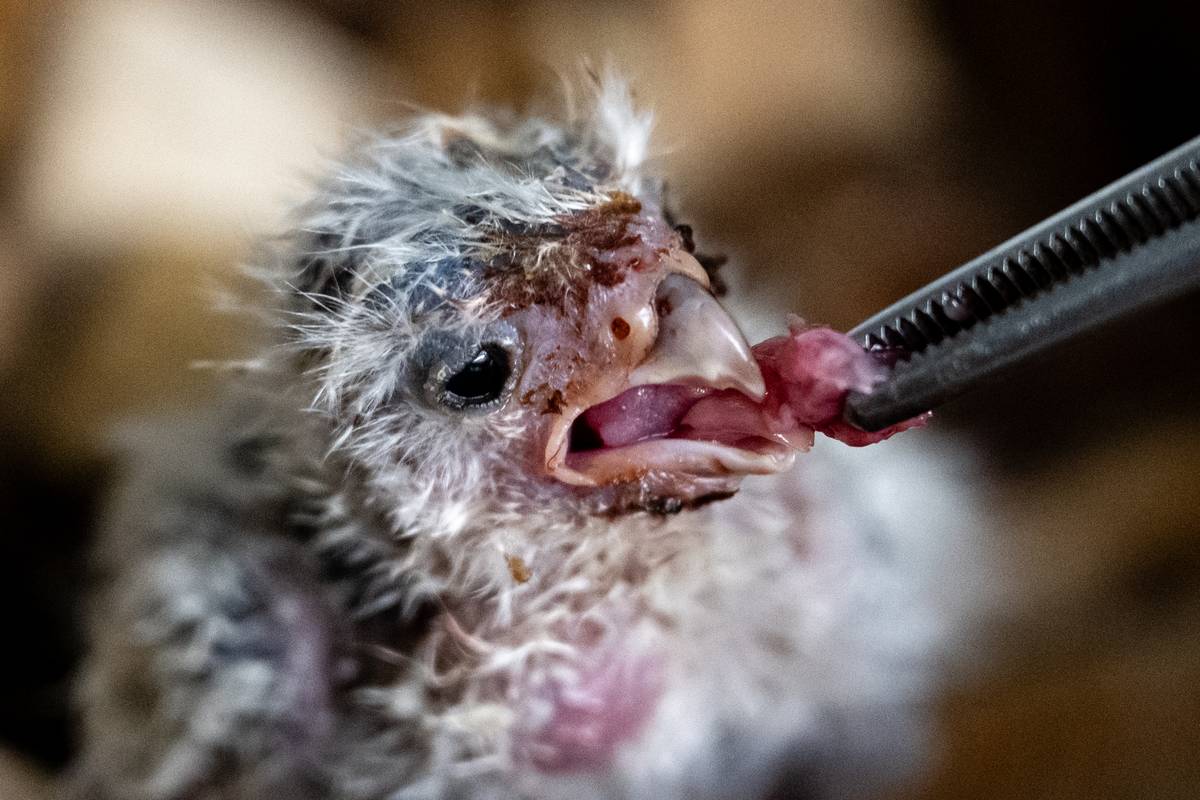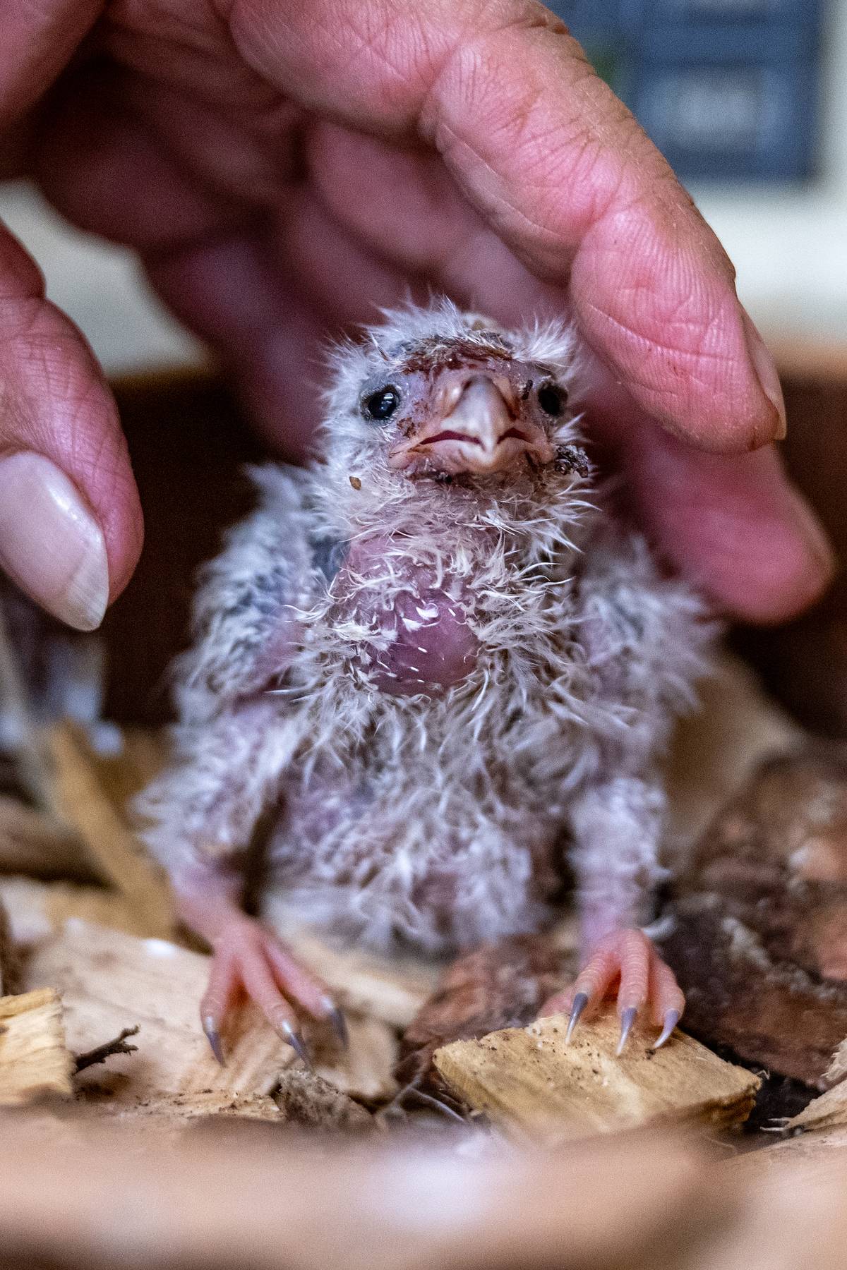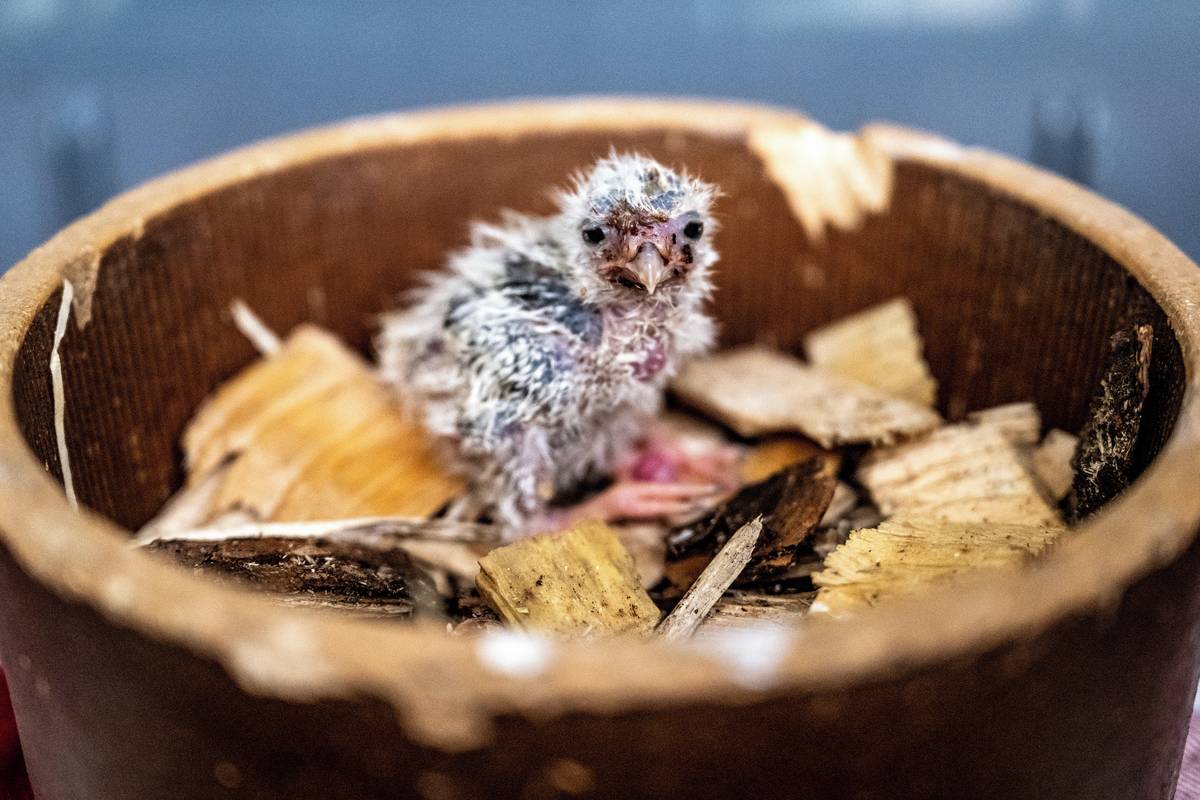 Sokolíka krmí ošetřovatelé každé dvě hodiny od šesti ráno do deseti večer. Mládě dostává kousky myších holátek
