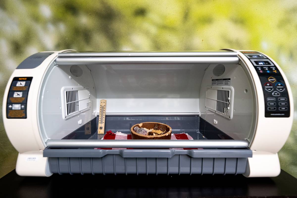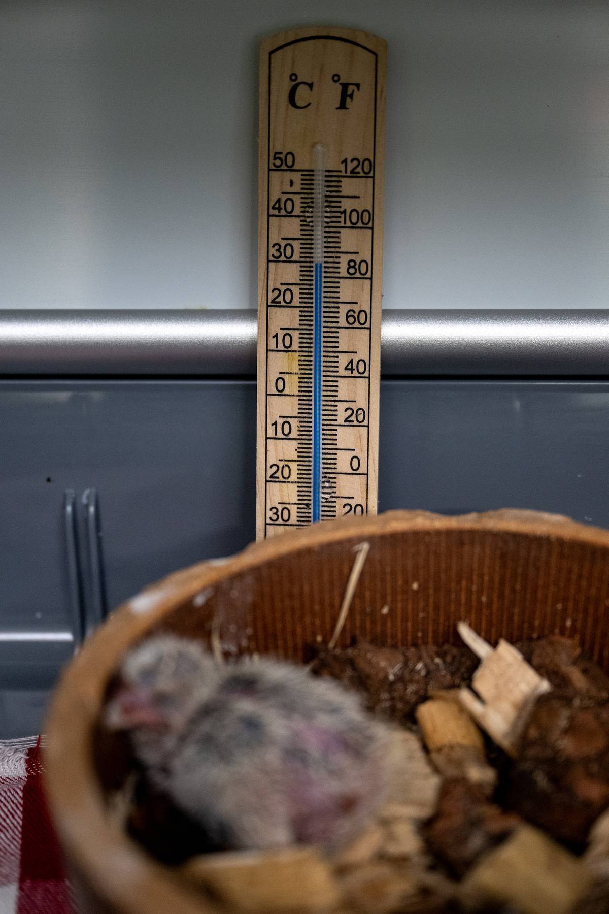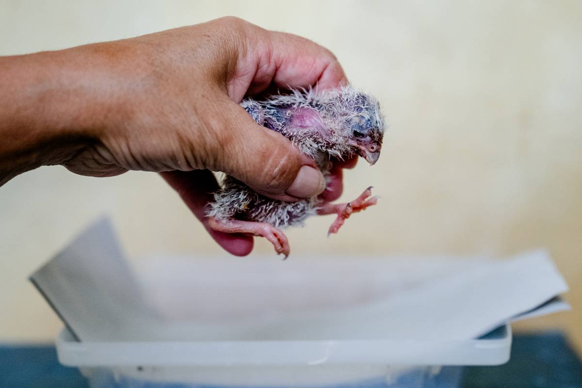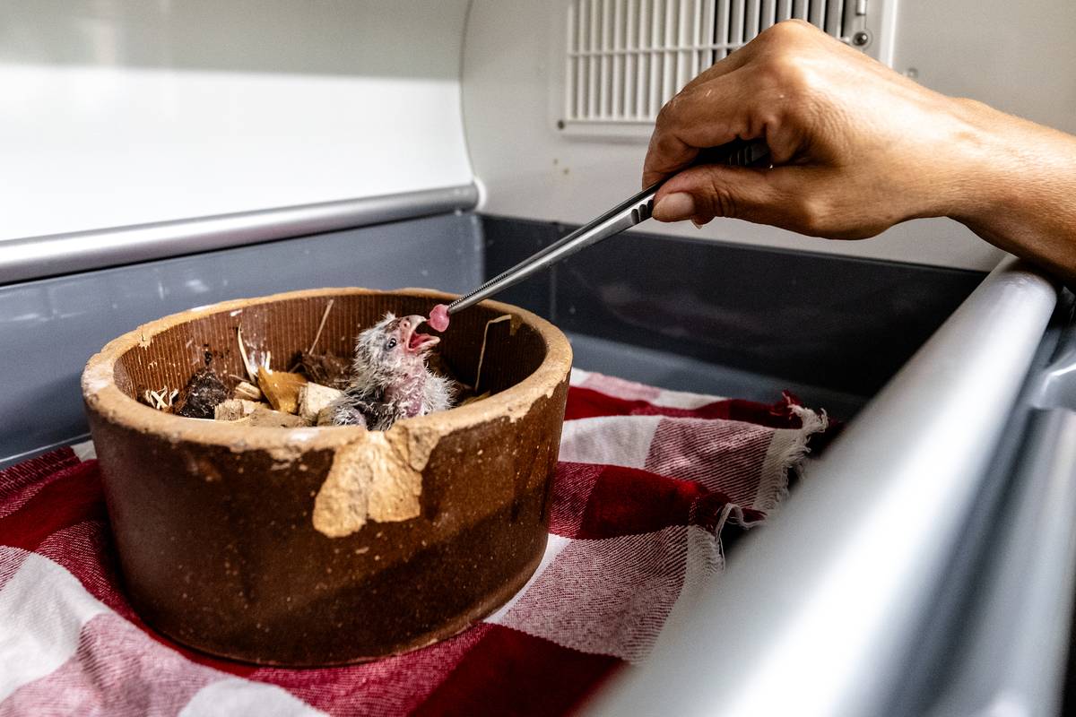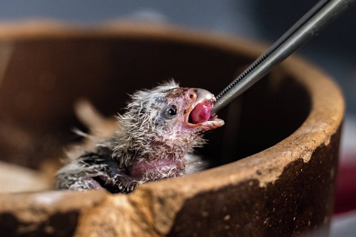 Mládě má v odchovně Ptačího světa speciální box, ve kterém na něj ošetřovatelé dohlížejí