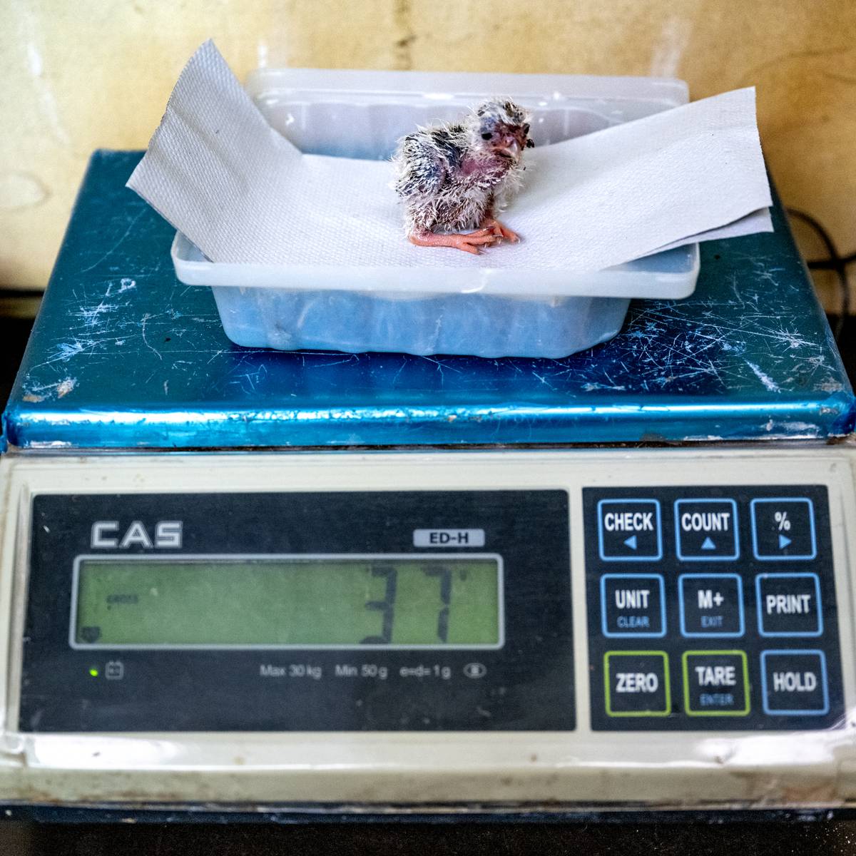 Vážení malého sokolíka. O víkendu dosáhl už na váhu 37 gramů