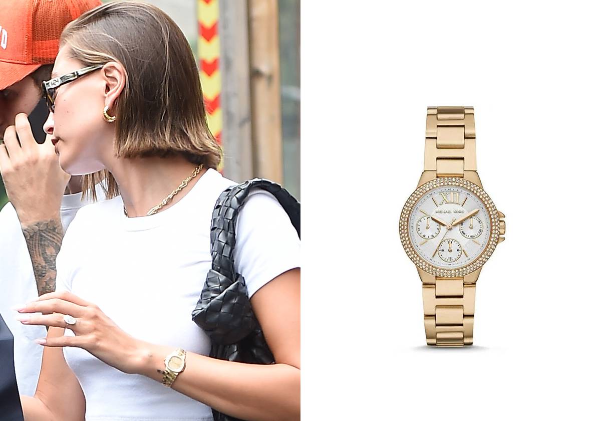 Modelka Hailey Bieber vlastní zlaté hodinky „Rolexky“ s diamanty okolo ciferníku. Našli jsme pro vás levnější variantu: Michael Kors, 4 605 Kč, prodává Mall