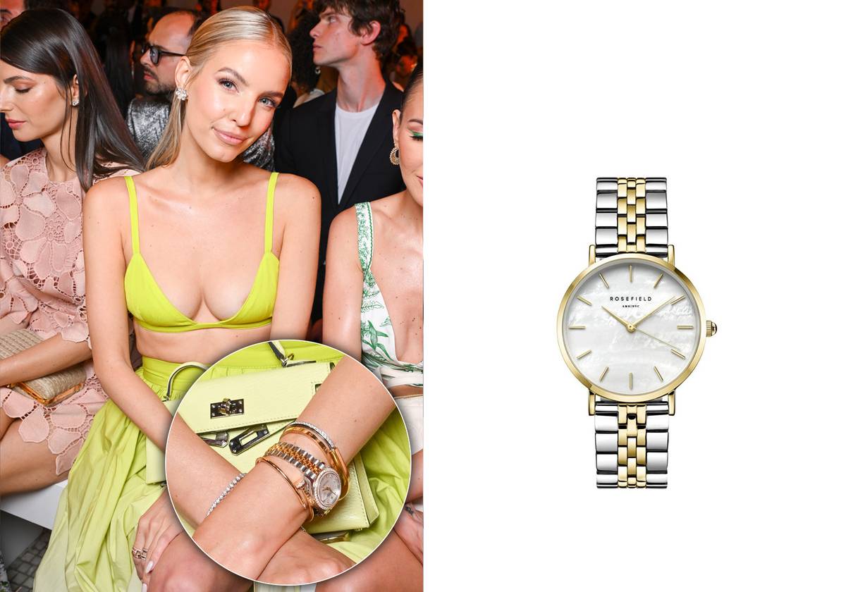 Dvoubarevné hodinky se spoustou náramků nosí Leonie Hanne, německá módní influencerka s 4,6 milionu sledujících. Rosefield, 3 029 Kč, prodává Vivantis