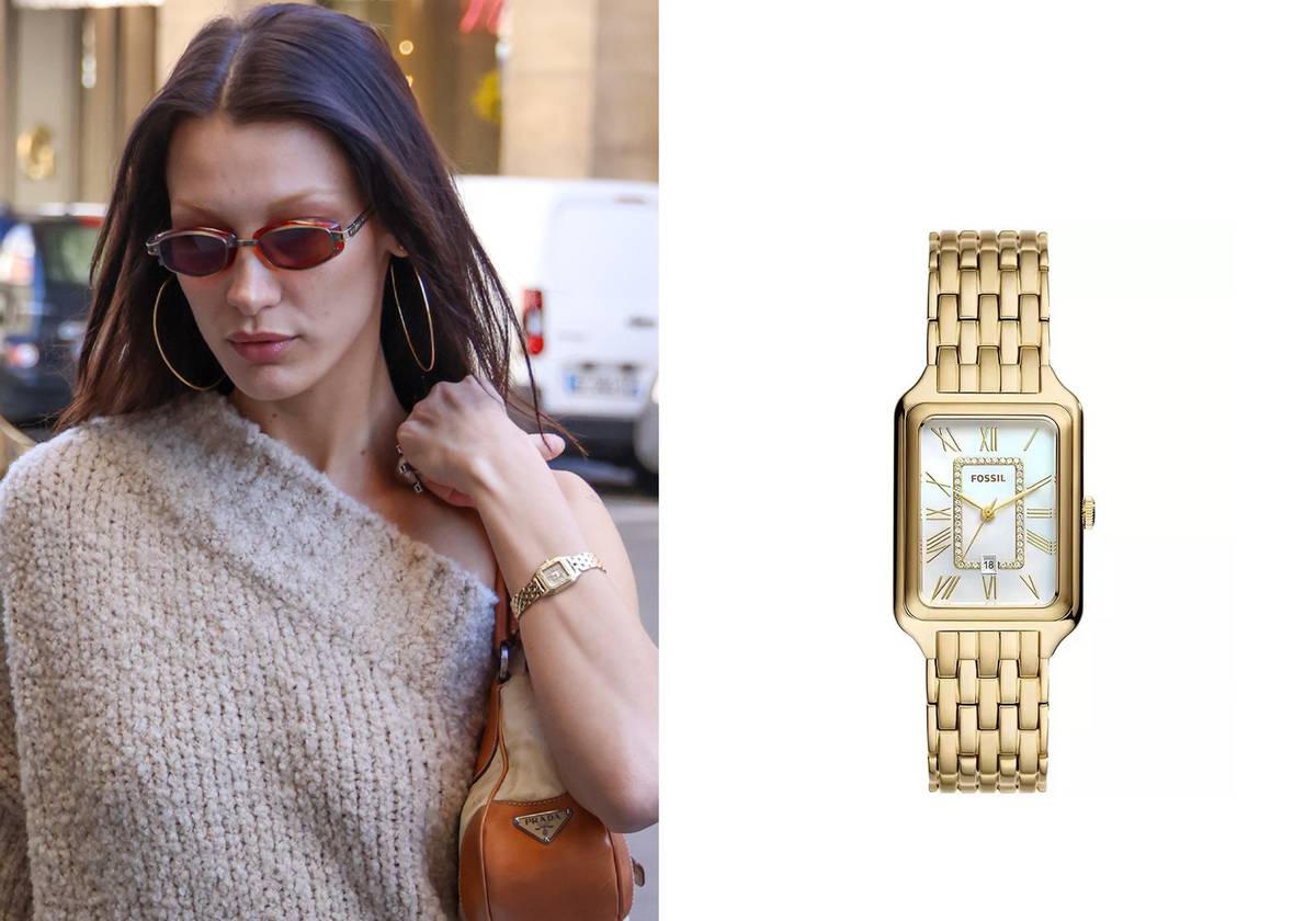 Zlaté hodinky Cartier, které stojí přes sto tisíc korun, zbožňuje i modelka Bella Hadid, jež je ráda kombinuje s nejrůznějšími náramky. Fossil, 4 899 Kč, prodává Hodinkovna