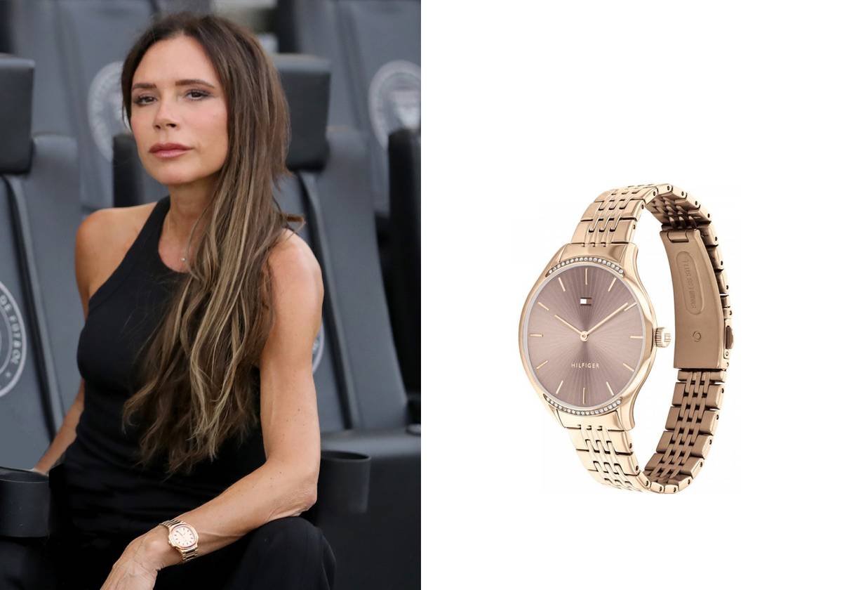 Módní návrhářka a Posh Spice nedávno vynesla hodinky v rose gold odstínu a s větším kulatým ciferníkem. Tommy Hilfiger, 3 157 Kč, prodává Timestore