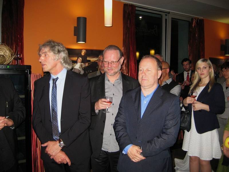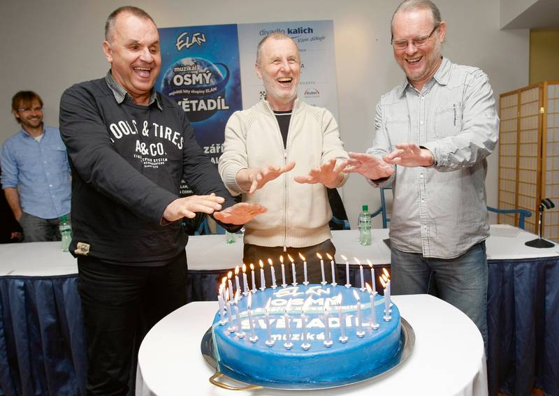 Členové kapely Elán (zprava) Vašo Patejdl, Ján Baláž a Jožo Ráž nečarují, jen si před sfouknutím svíček nejprve nahřáli dlaně. Zcela vzadu se culí Ján Ďurovčík. Rok 2012.