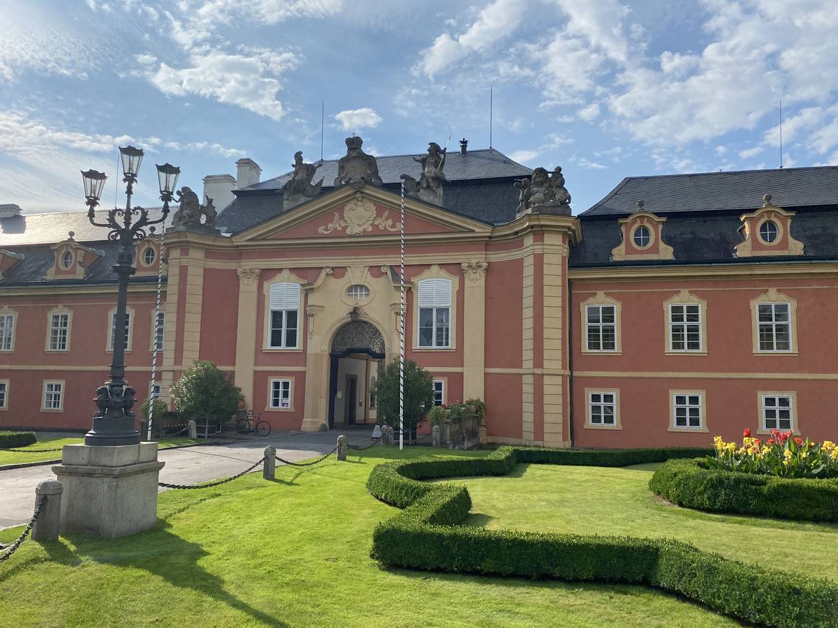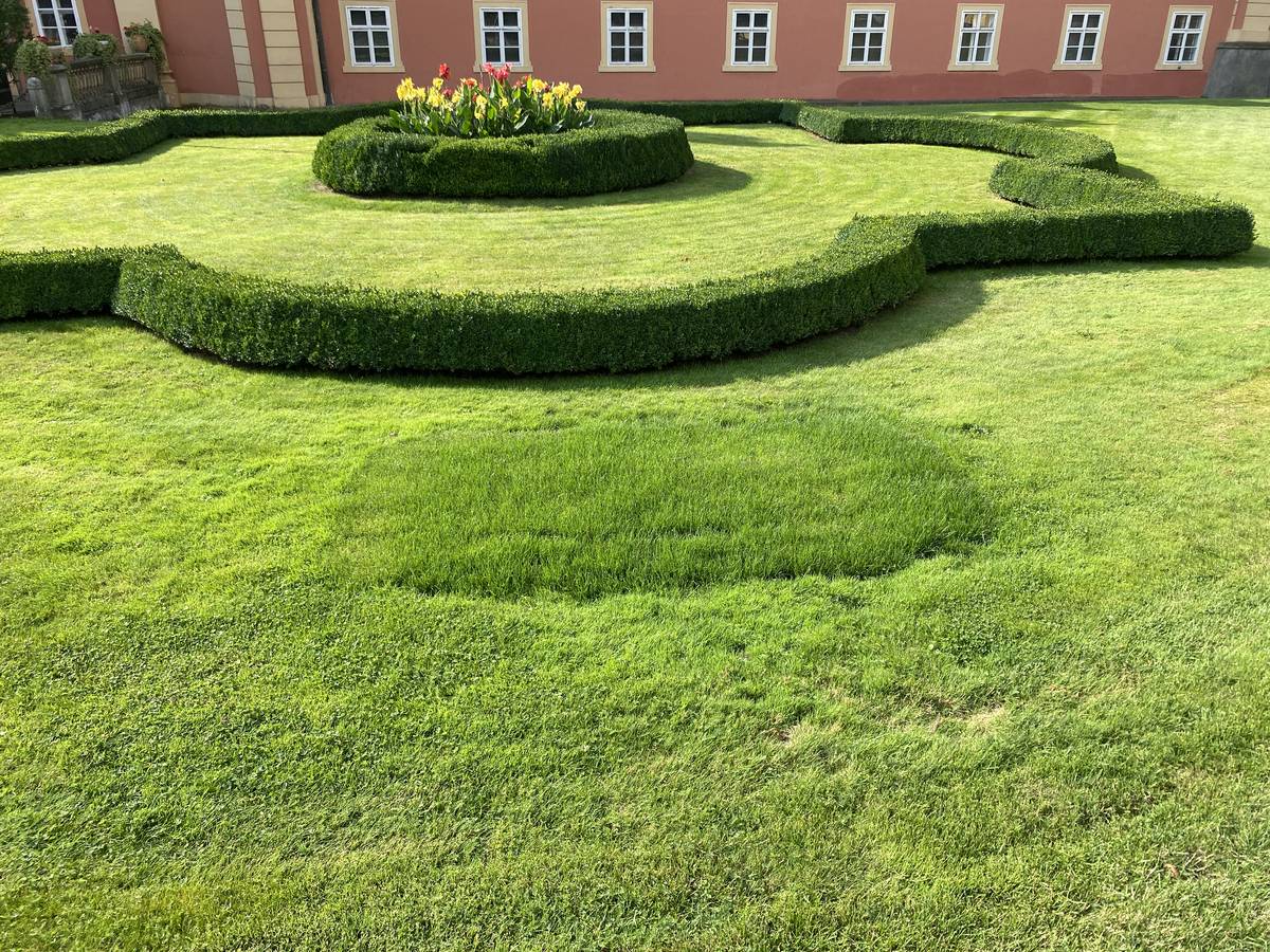 Dnes už je před zámkem vysazená nová tráva, ale jsou poznat obrysy původního místa.