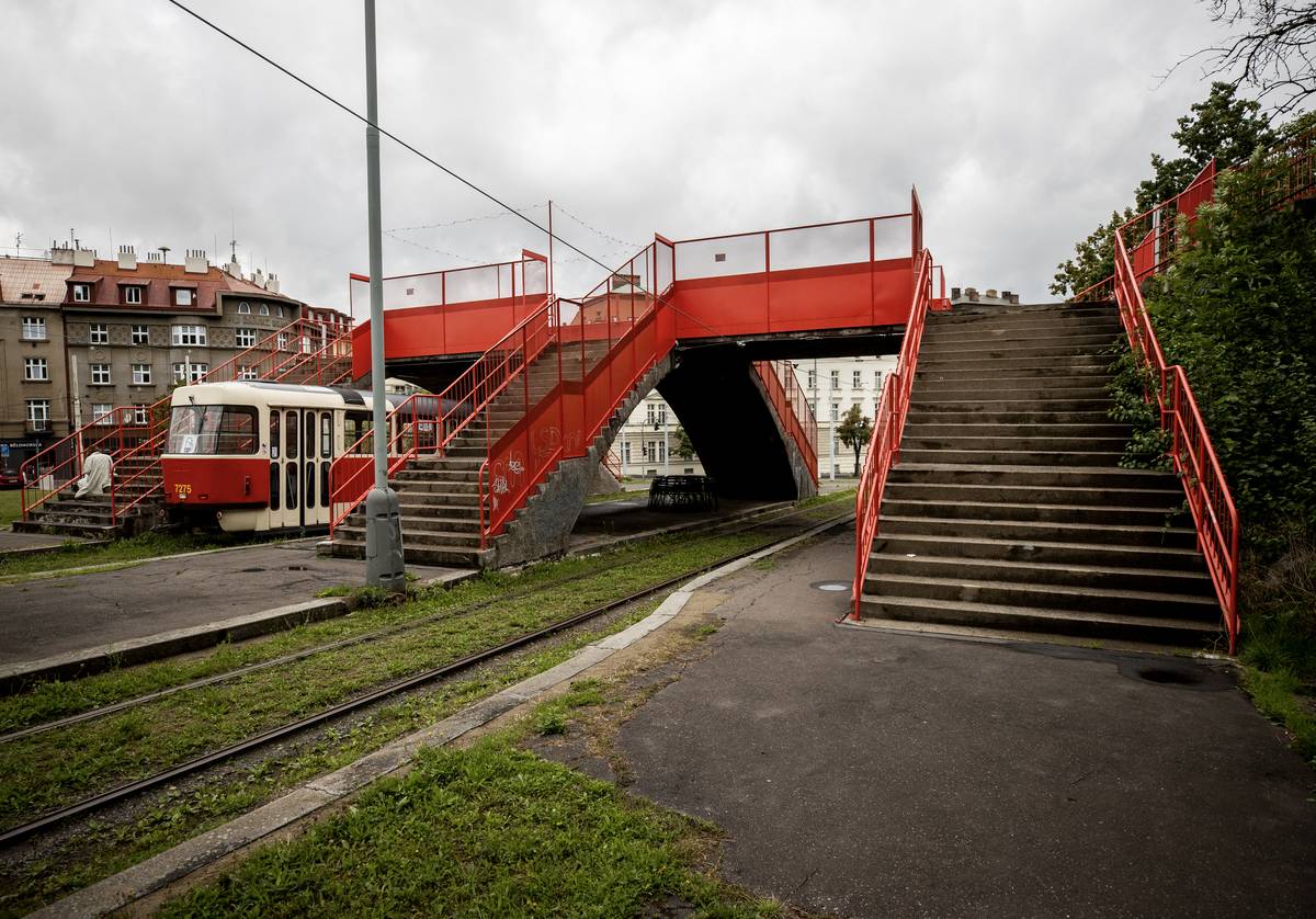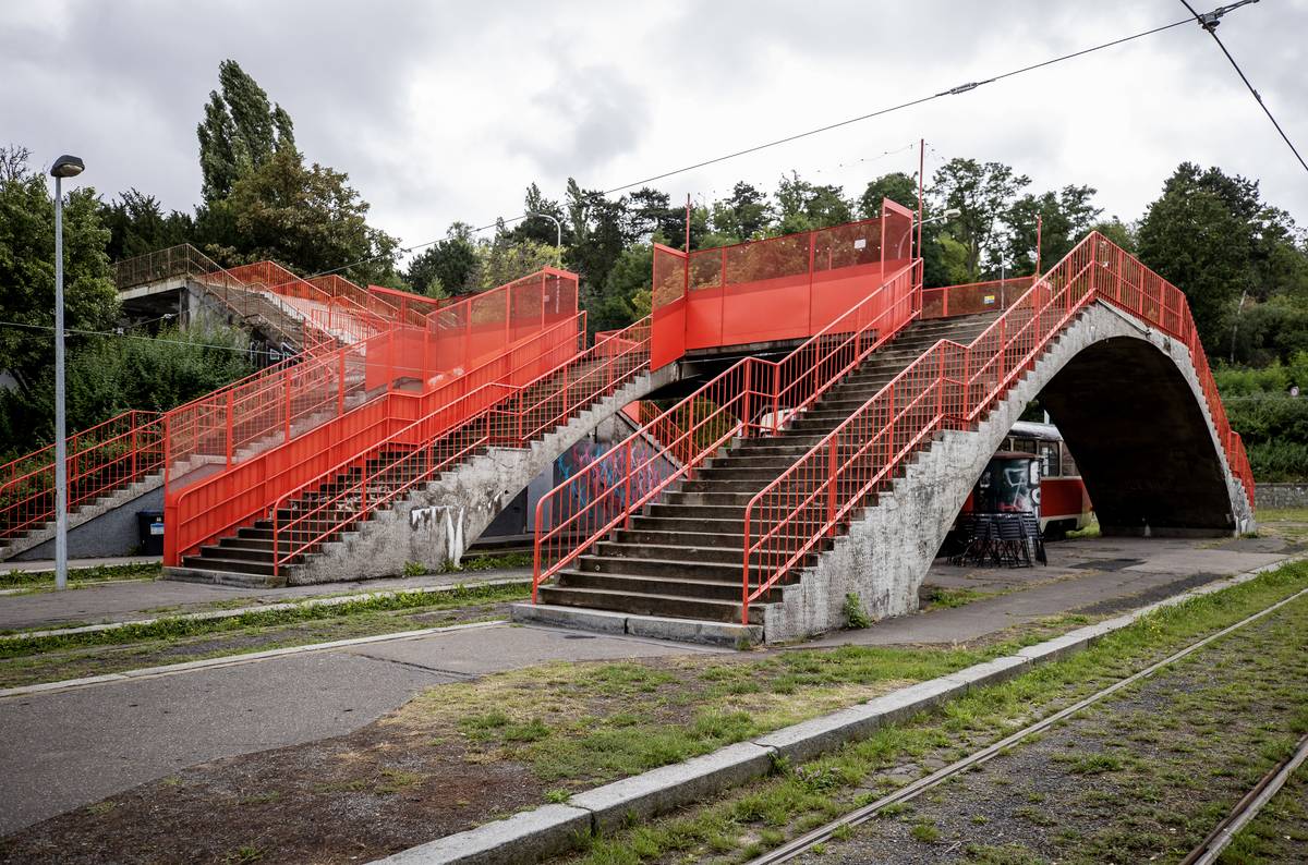 Nepoužívaná tramvajová točna v Praze na Dlabačově s přilehlou železobetonovou lávkou. Na prostřední koleji smyčky stojí vyřazená tramvaj T3.