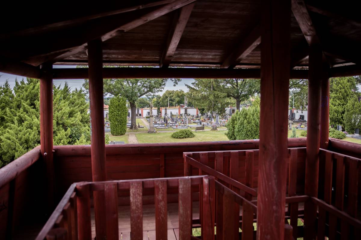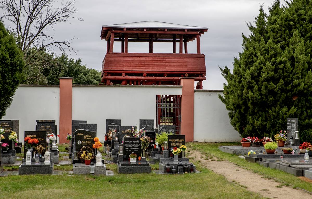Z jedné strany návštěvníci shlíží na hřbitov.