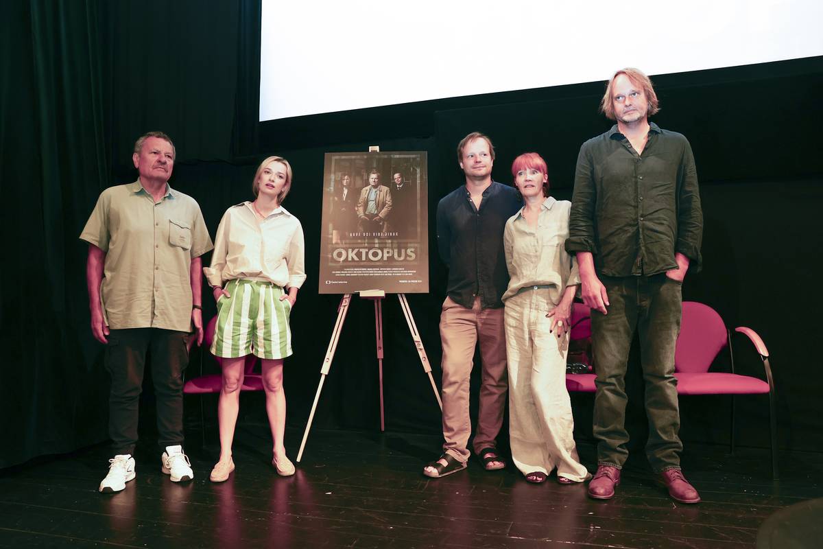 Novinářská projekce kriminálního seriálu Oktopus v produkci České televize. Na snímku herci Miroslav Krobot a Marika Šoposká, Kryštof Hádek, Pavlína Mourková, režisér a scenárista Jan Pachl.