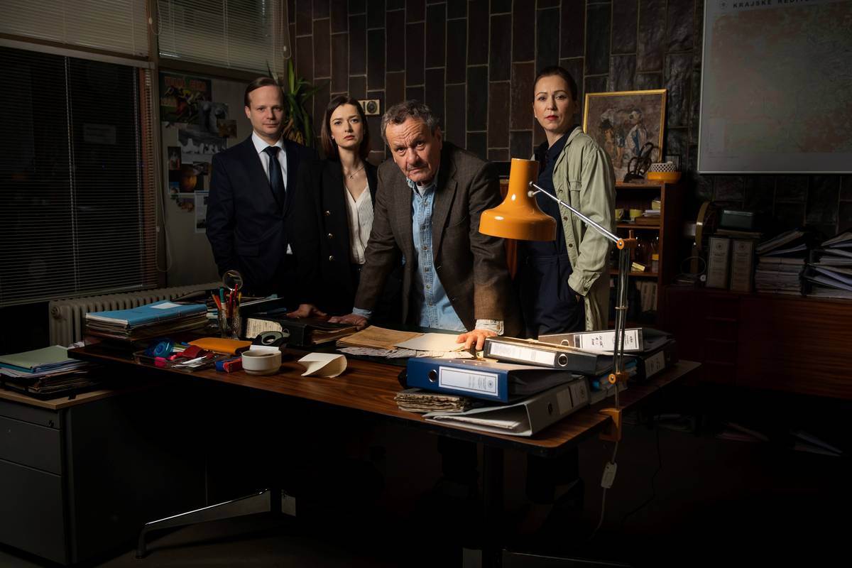 Novinářská projekce kriminálního seriálu Oktopus v produkci České televize. Na snímku herci Miroslav Krobot a Marika Šoposká, Pavlína Mourková, Kryštof Hádek.