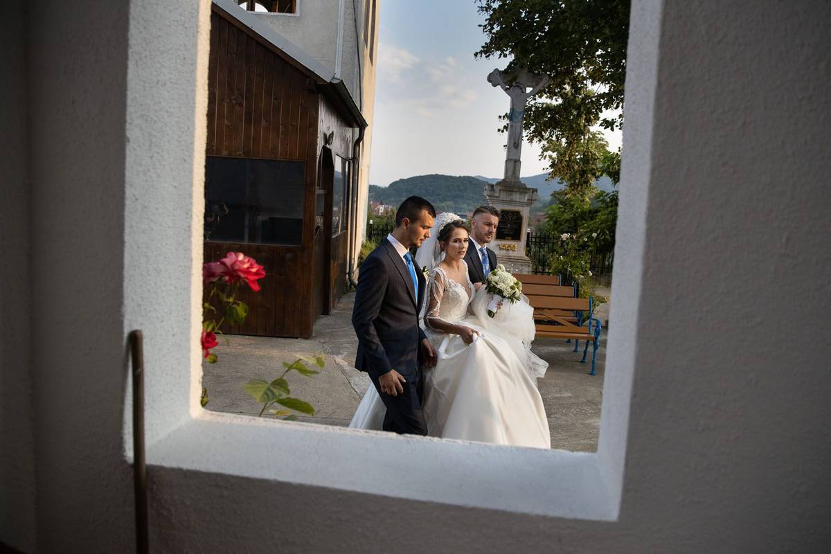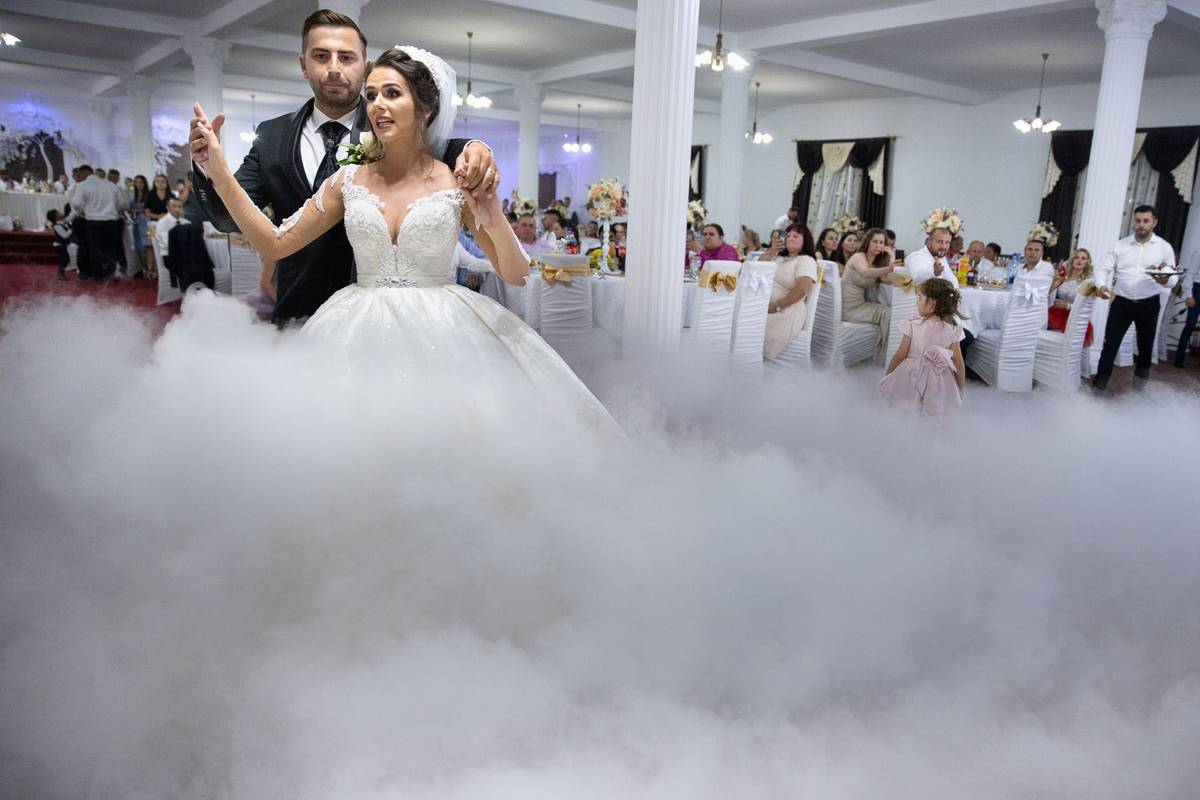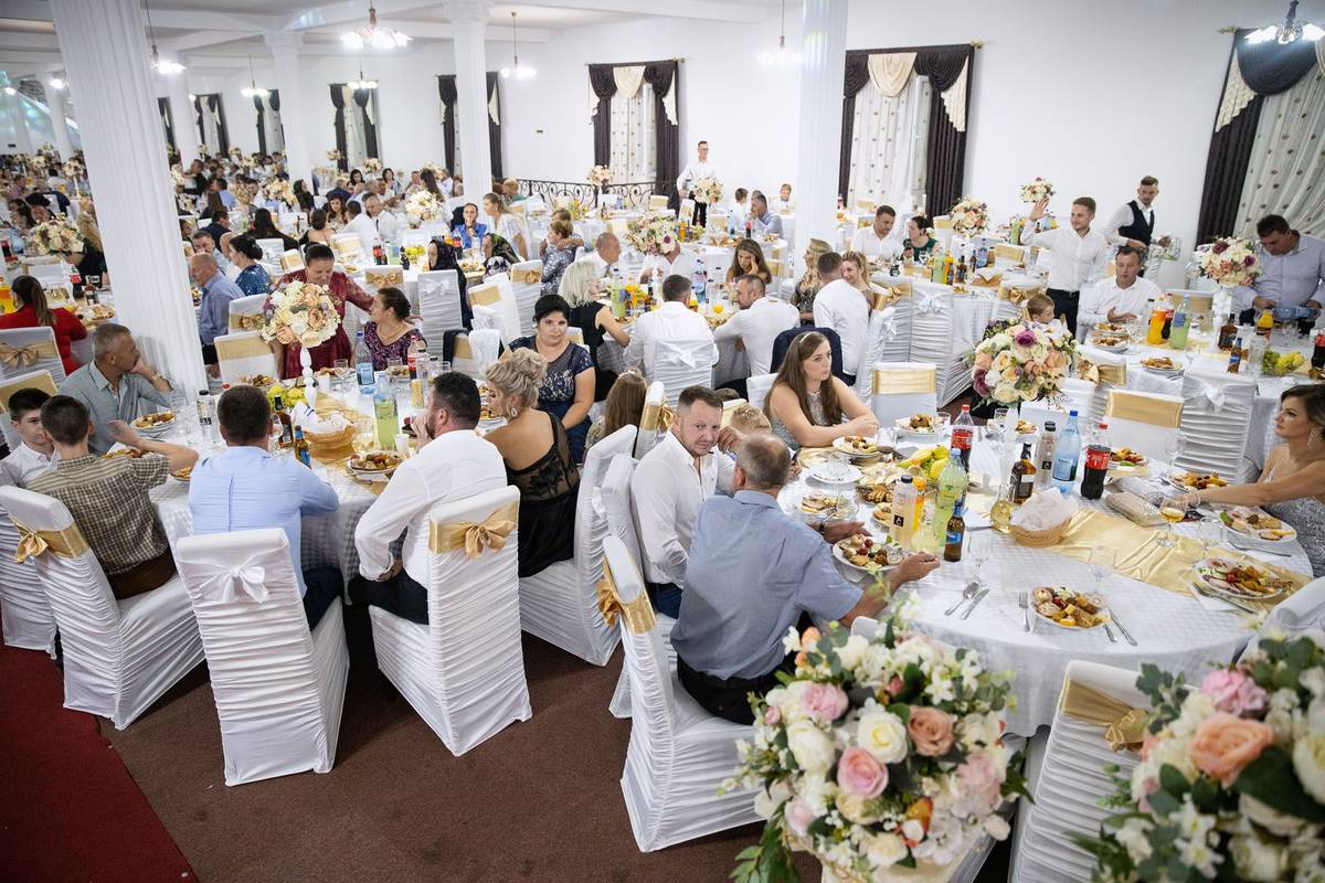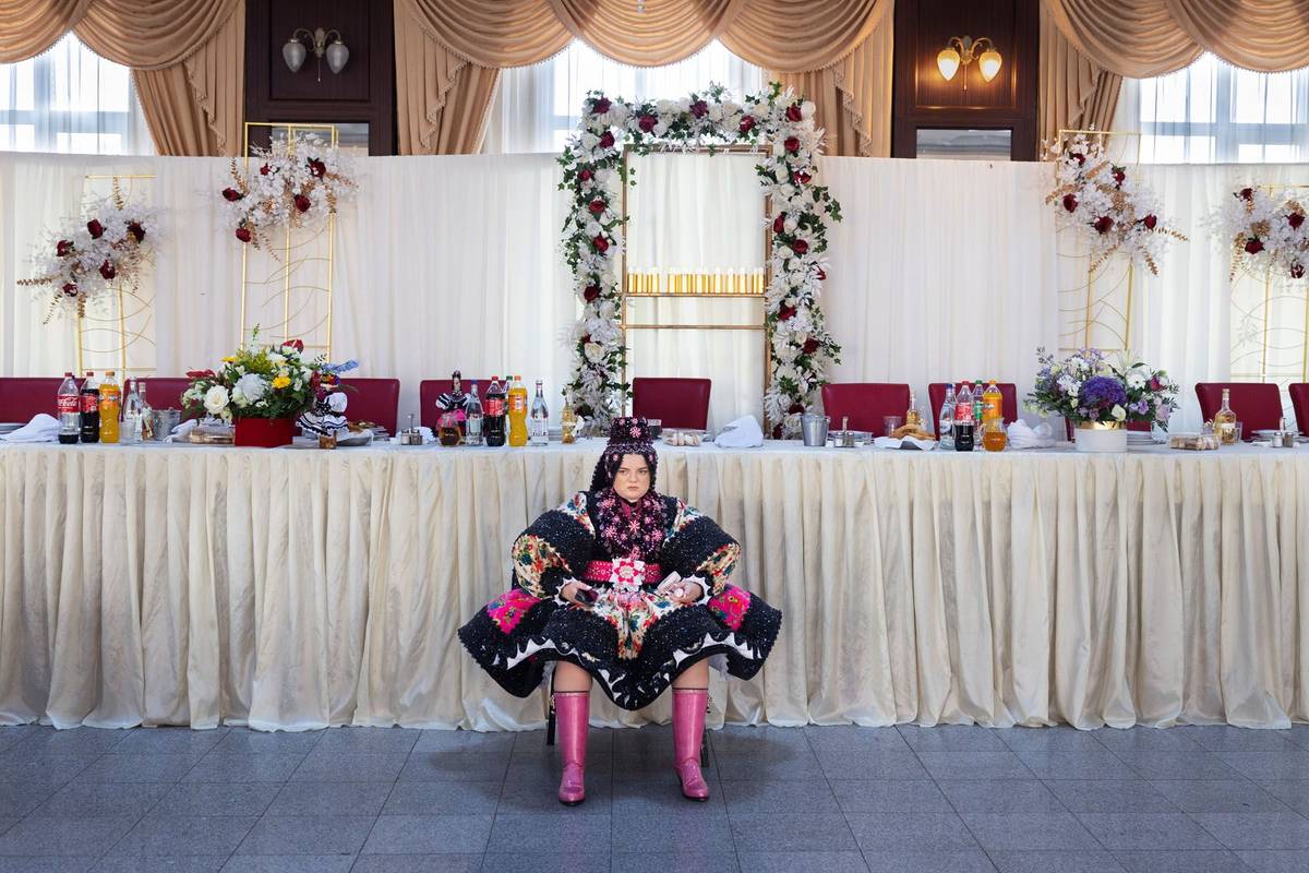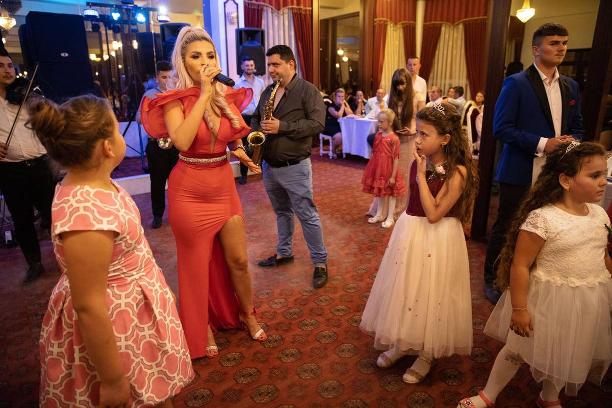Opuštěná a unavená nevěsta Adina Prodan ve svatebním sále v obci Racsa. Většina svatebčanů se vyhrnula ven na parkoviště, aby přivítali slavného zpěváka z jižního Rumunska.