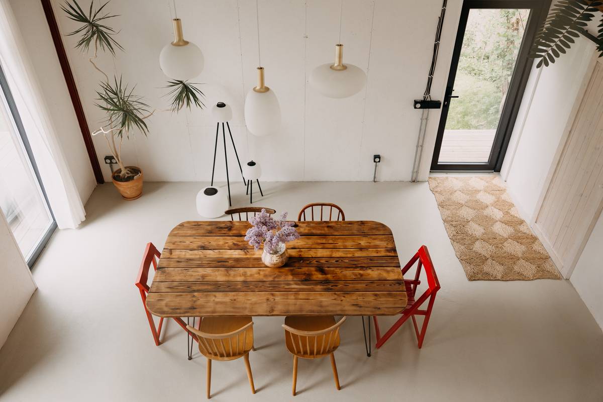 Uvnitř rekonstruované stavby se nachází krásný stůl vytvořený ze starých dveří