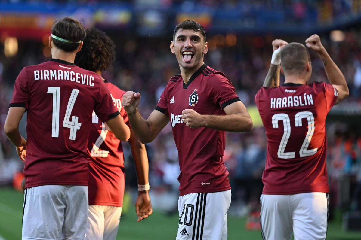Fotbalisté Sparty se radují z bleskové trefy Qazima Laciho.
