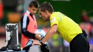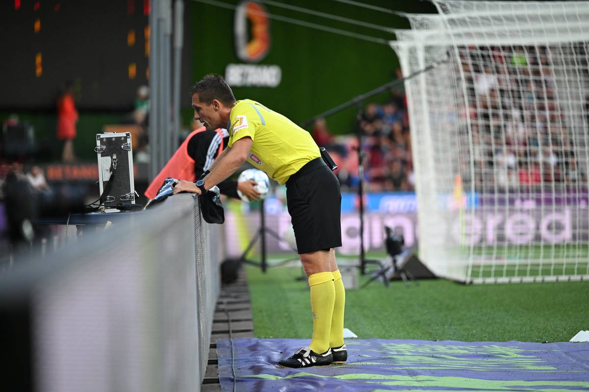 Sudí Ondřej Pechanec přezkoumává druhý gól Plzně, který nakonec neplatil.