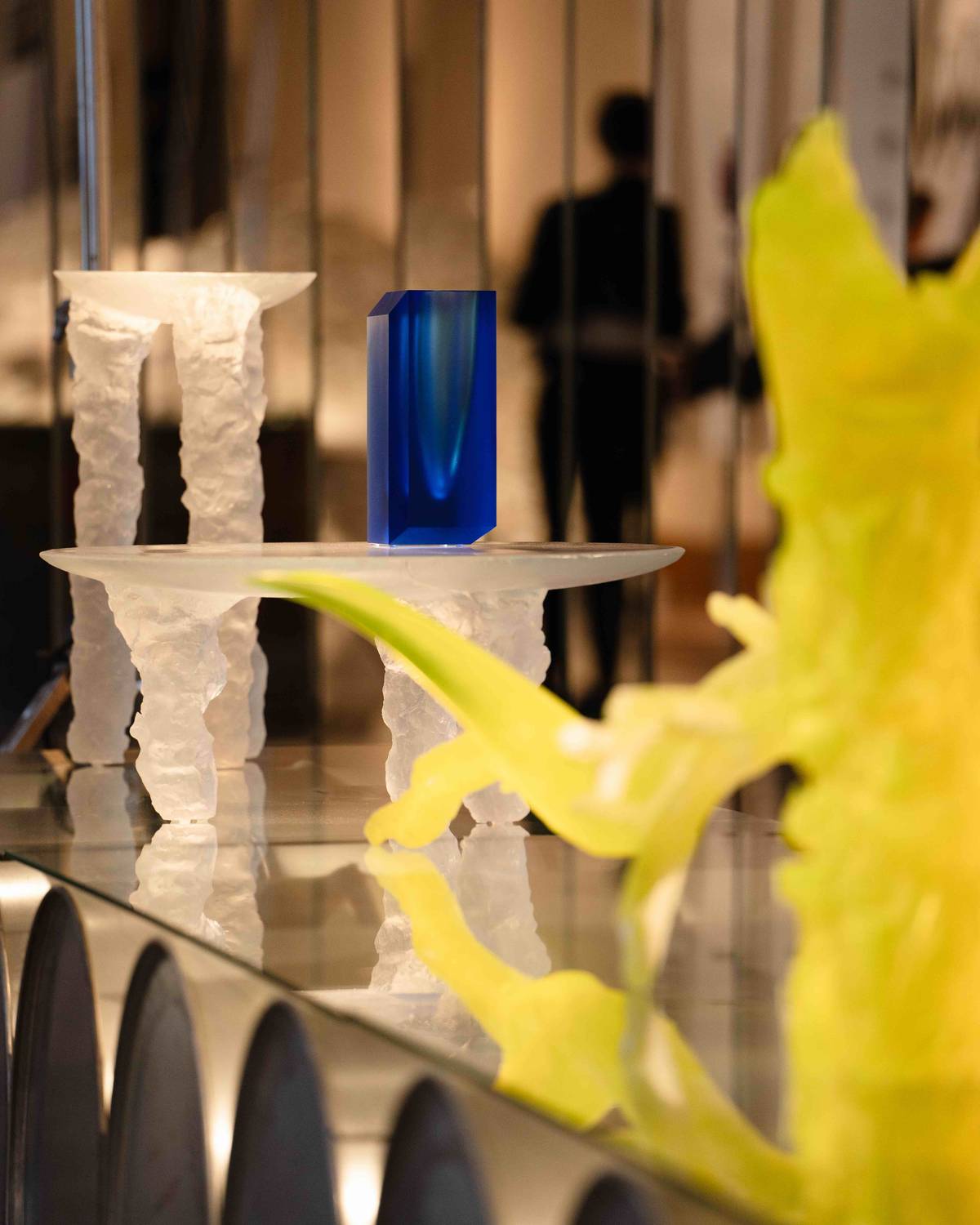Stolky z kolekce Utopia od designéra Johana Pertla vypadají jako vytesané z ledu. Pertl je ručně modeluje ze skla speciální autorskou technikou. Díky inovované metodě litého skla spotřebuje méně materiálu a urychlí tavení v peci, což snižuje zátěž pro životní prostředí a objevuje nové možnosti formování. Na Pertlově stolku pak stojí váza Abyss designéra Jana Plecháče, která je první vlaštovkou nové vize pro tradiční karlovarskou sklárnu. Navazuje v ní na tradici ručního broušení i na schopnost tavit unikátní odstíny skloviny. Zároveň je vůbec nejtěžším kusem skla, který se kdy v Moseru podařilo ručně vyfouknout.