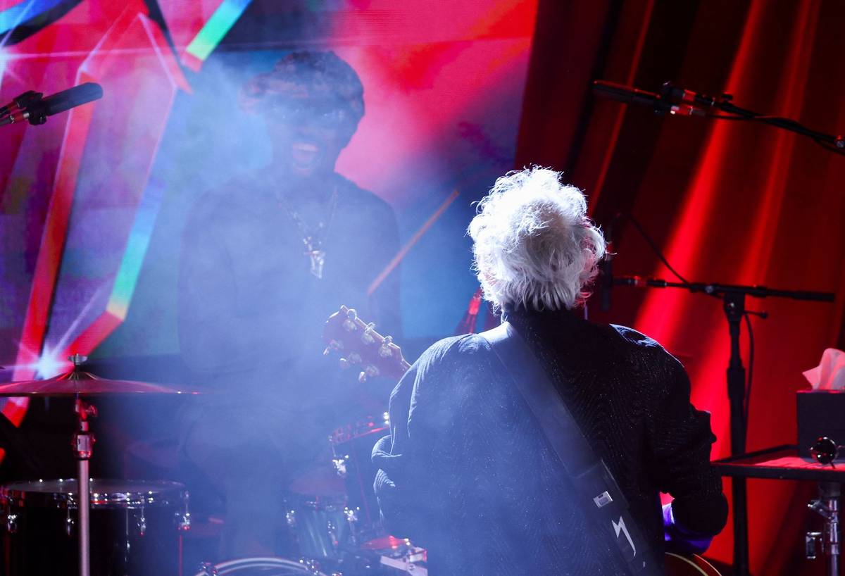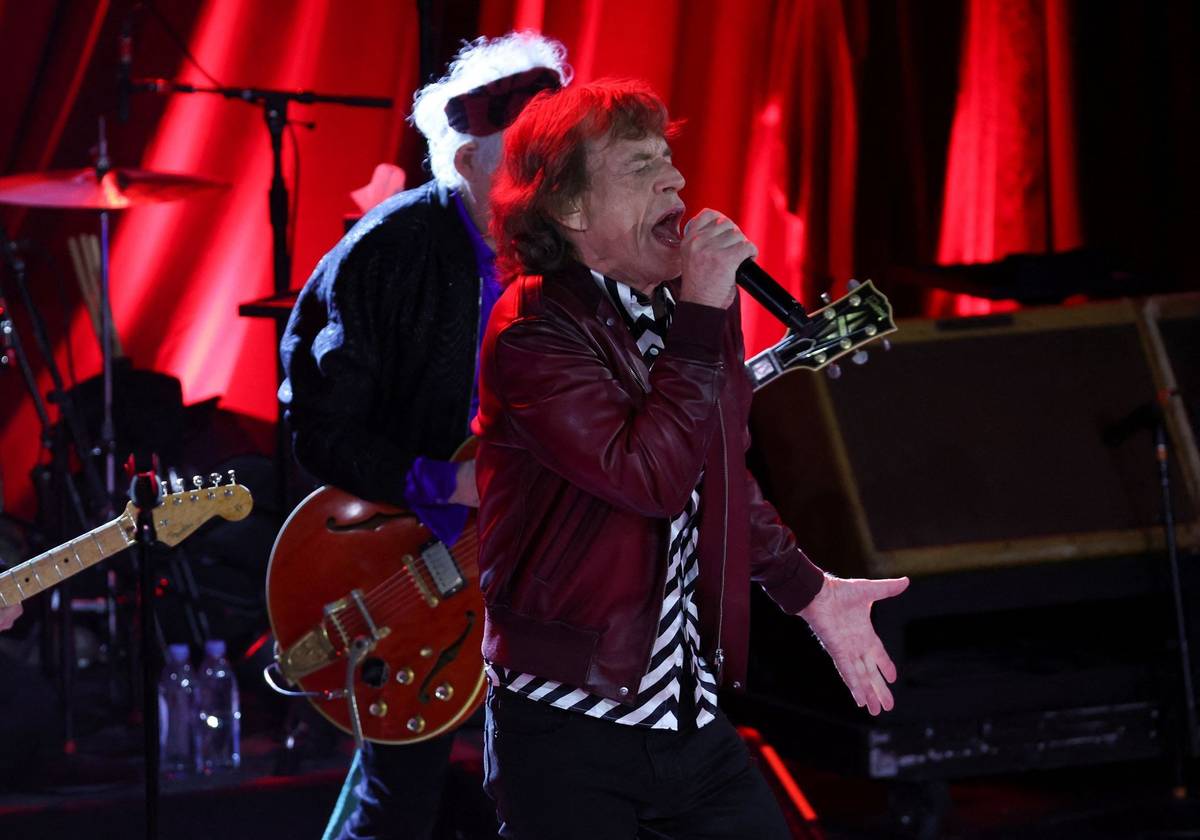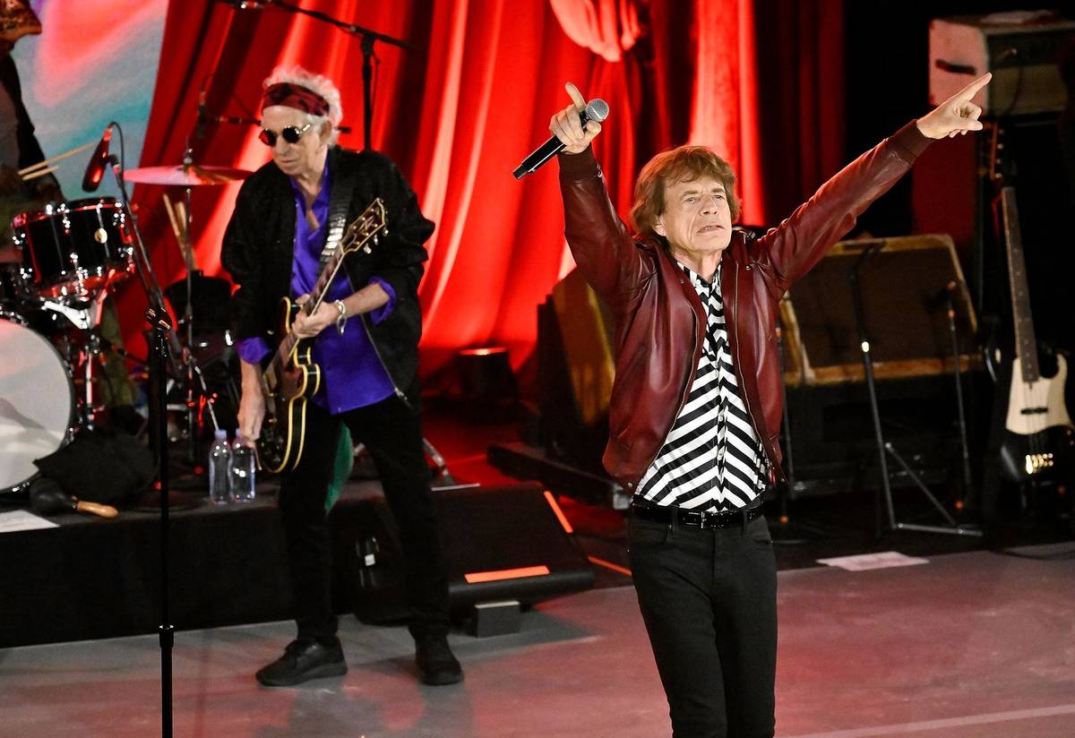 Ron Wood, Mick Jagger a Keith Richards z Rolling Stones v dresech fotbalového klubu FC Barcelona.