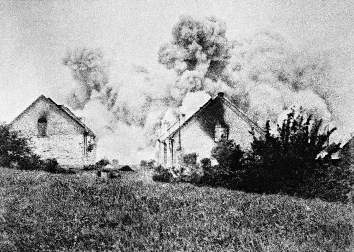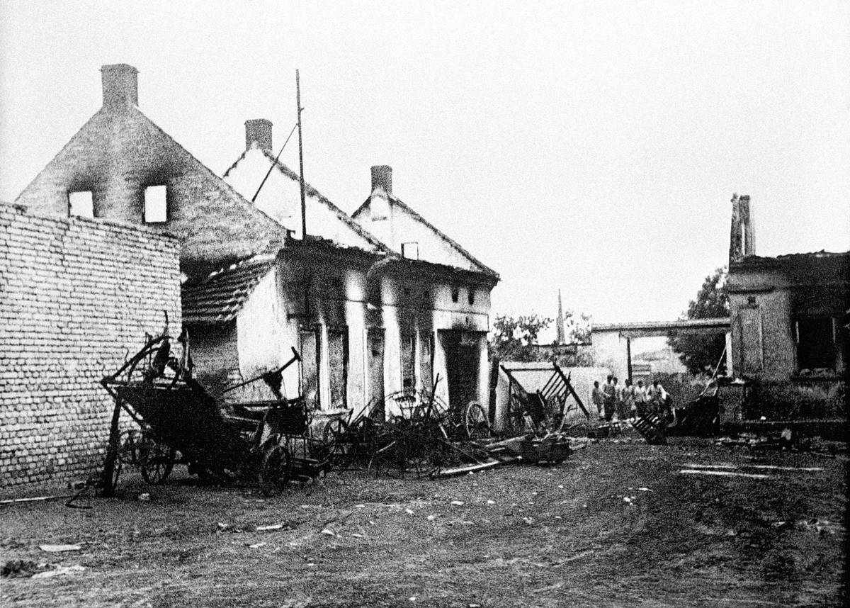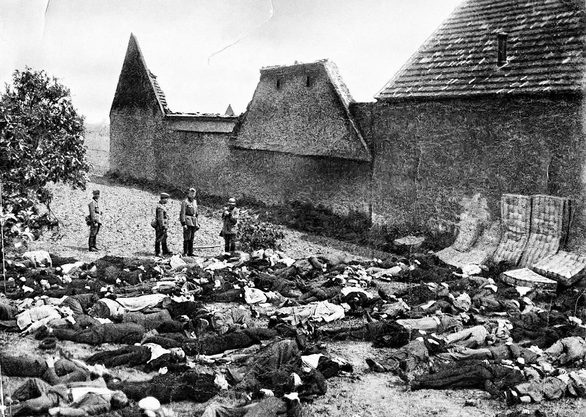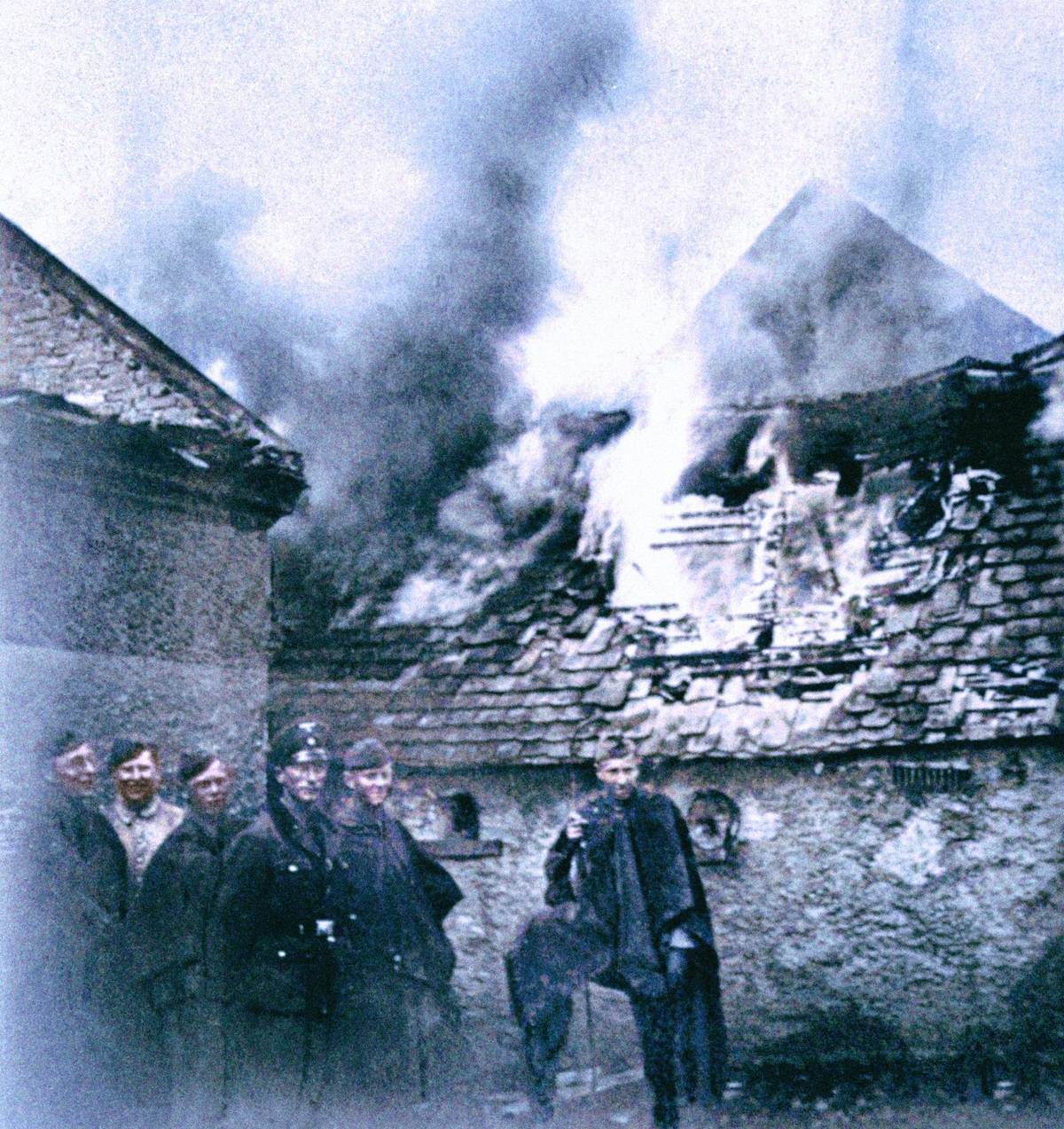 Tank Lidice s maskovanými samopalníky 1. čs. armádního sboru v SSSR. Vypálená obec jako symbolická motivace pro československé vojáky.