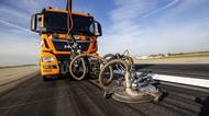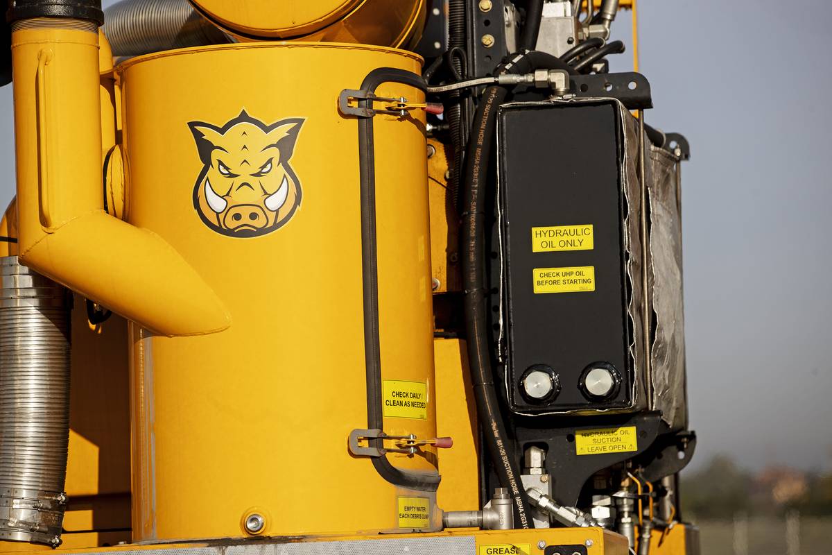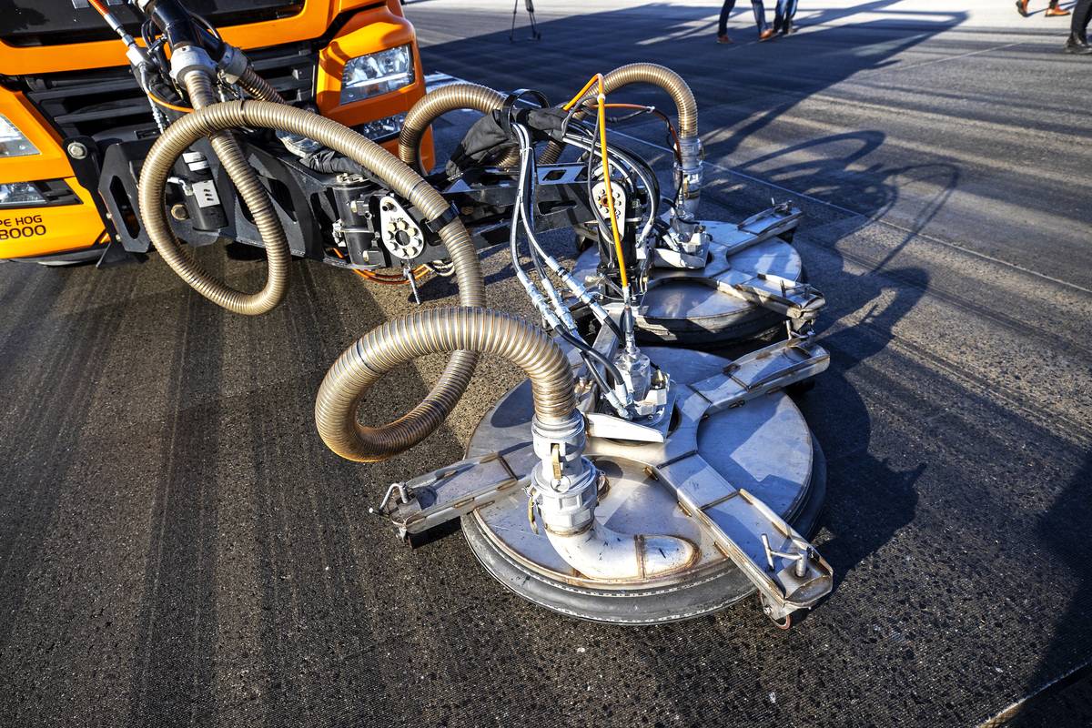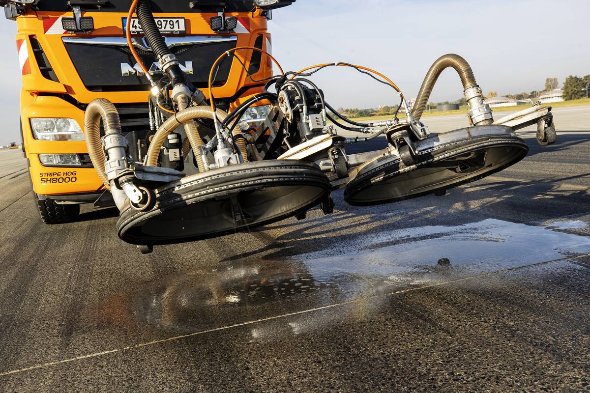 Trysky vystřikují vodu pod tlakem 2500 barů, a oddělují tak gumu od asfaltu.