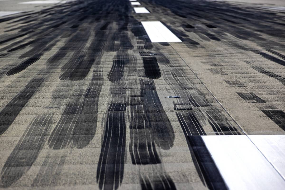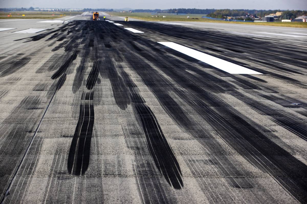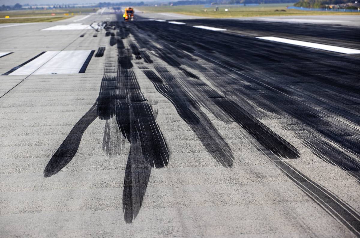V důsledku prudkého brždění a zahřátí pneumatik zůstávají na dráze při dosedání letadla části pneumatik, které vytvářejí černou gumovou vrstvu na asfaltu.