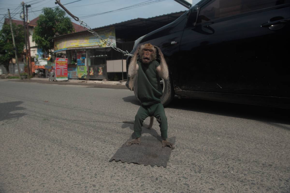 Makak dlouhoocasý během pouličního cirkusového představení, vyfoceno 29. listopadu na severu indonéského ostrova Sumatra.