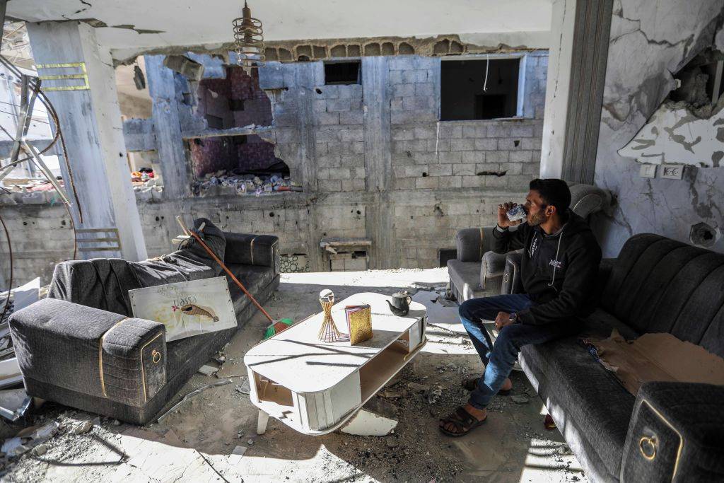 Devětadvacetiletý Palestinec zkoumá škody na svém domě zasaženém leteckým úderem. Jihad Nabil Abu Tuaima se nedávno oženil, s manželkou strávili v tomto bytě sotva pár dní. Chán Júnis, jižní část Pásma Gazy, 30. listopadu.