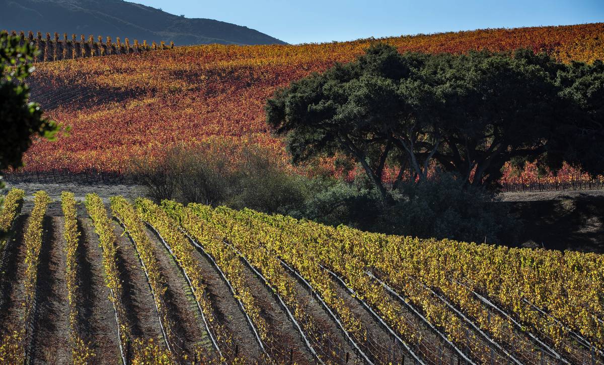 Vinice Pinot noi se zbarvily do podzimních barev, vyfoceno 26. listopadu v Kalifornii.