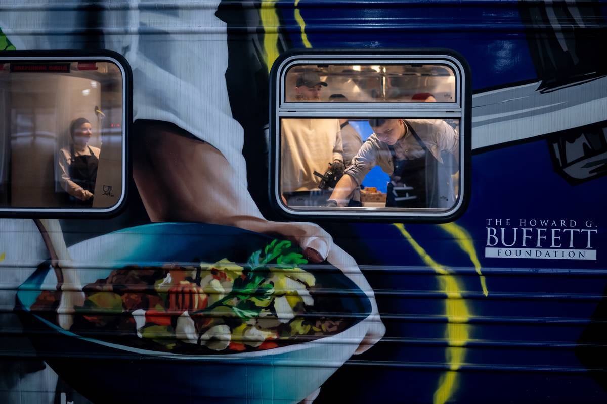 Pracovníci ukrajinské železniční společnosti Ukrzaliznycja připravují ve vlaku v Kyjevě slavnostní pokrmy u příležitosti státního svátku, 23. listopadu. Vlak míří do Izjumu, který leží nedaleko frontové linie.