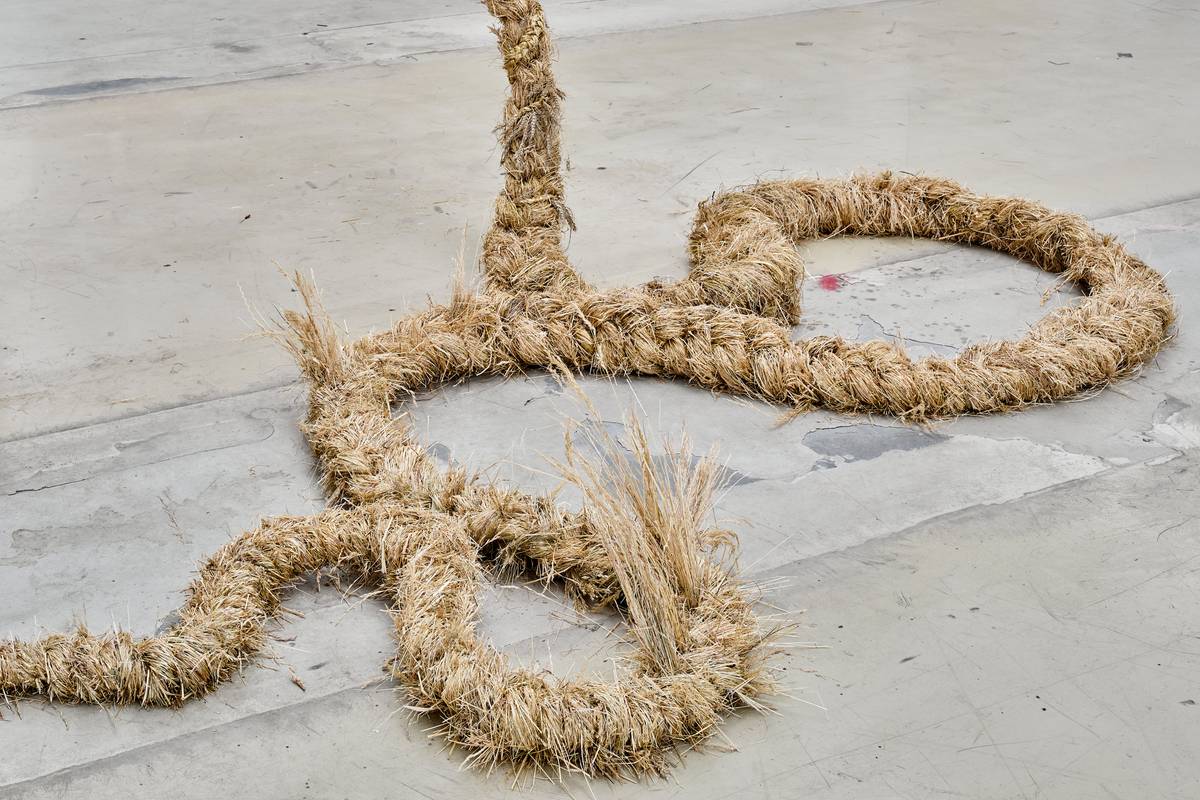 Dílo vzniklo splétáním sena a slámy a částečným oplétáním kovových konstrukcí.