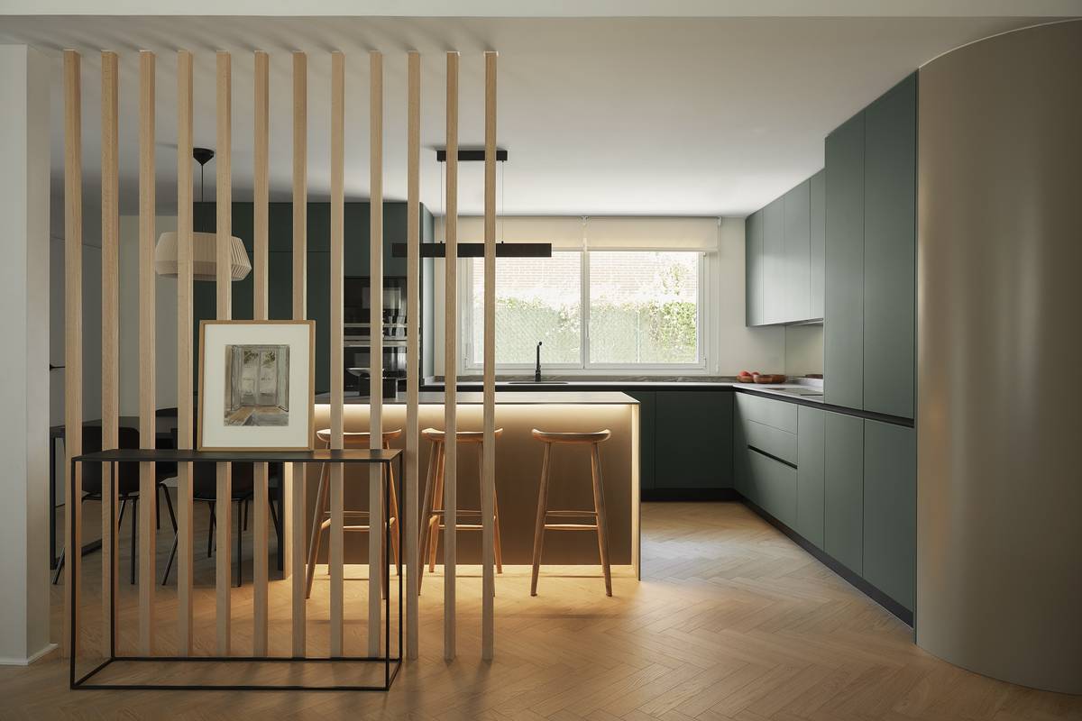 Středový ostrůvek je tak vysoký, aby u něj mohl herec snídat na stojáka, jak to má rád