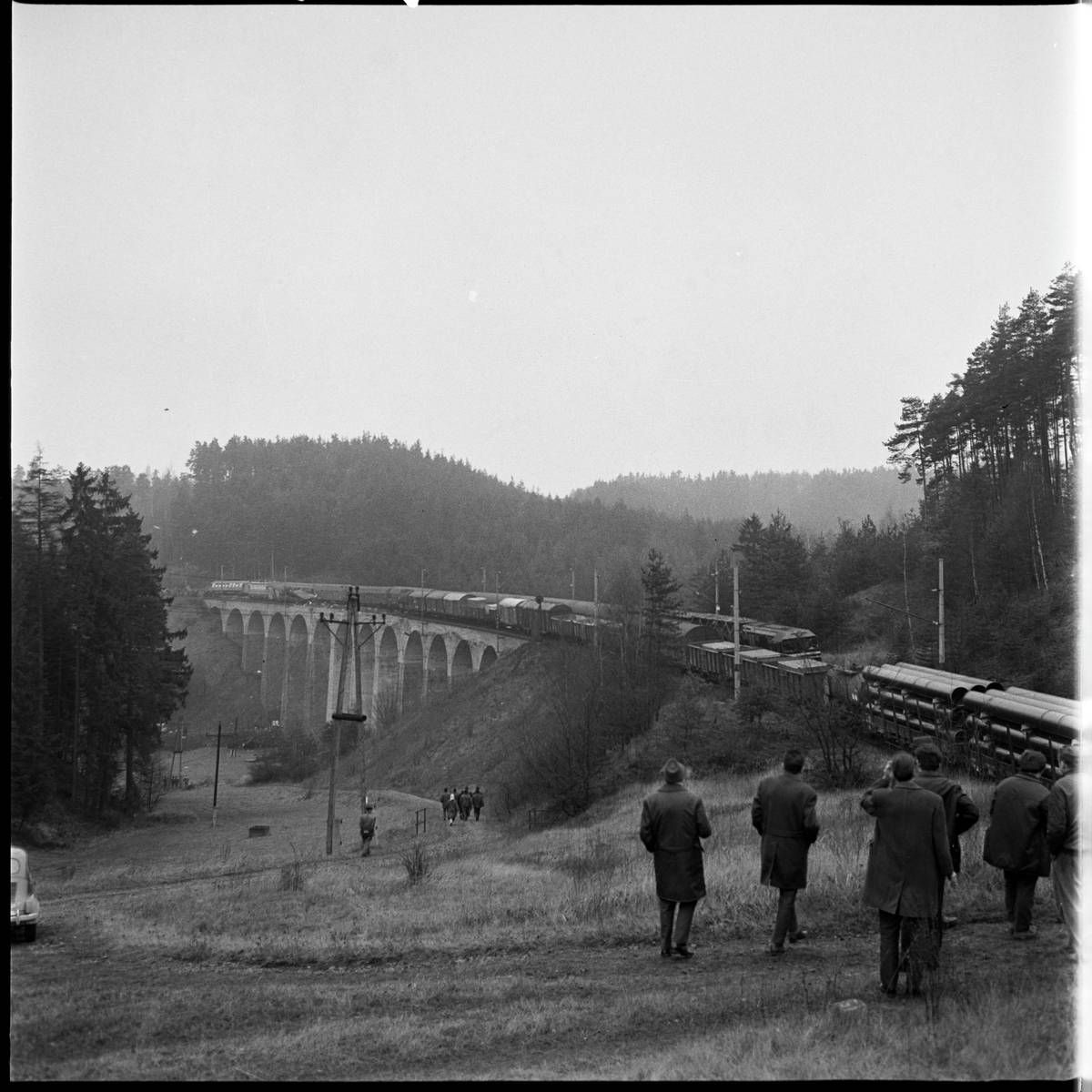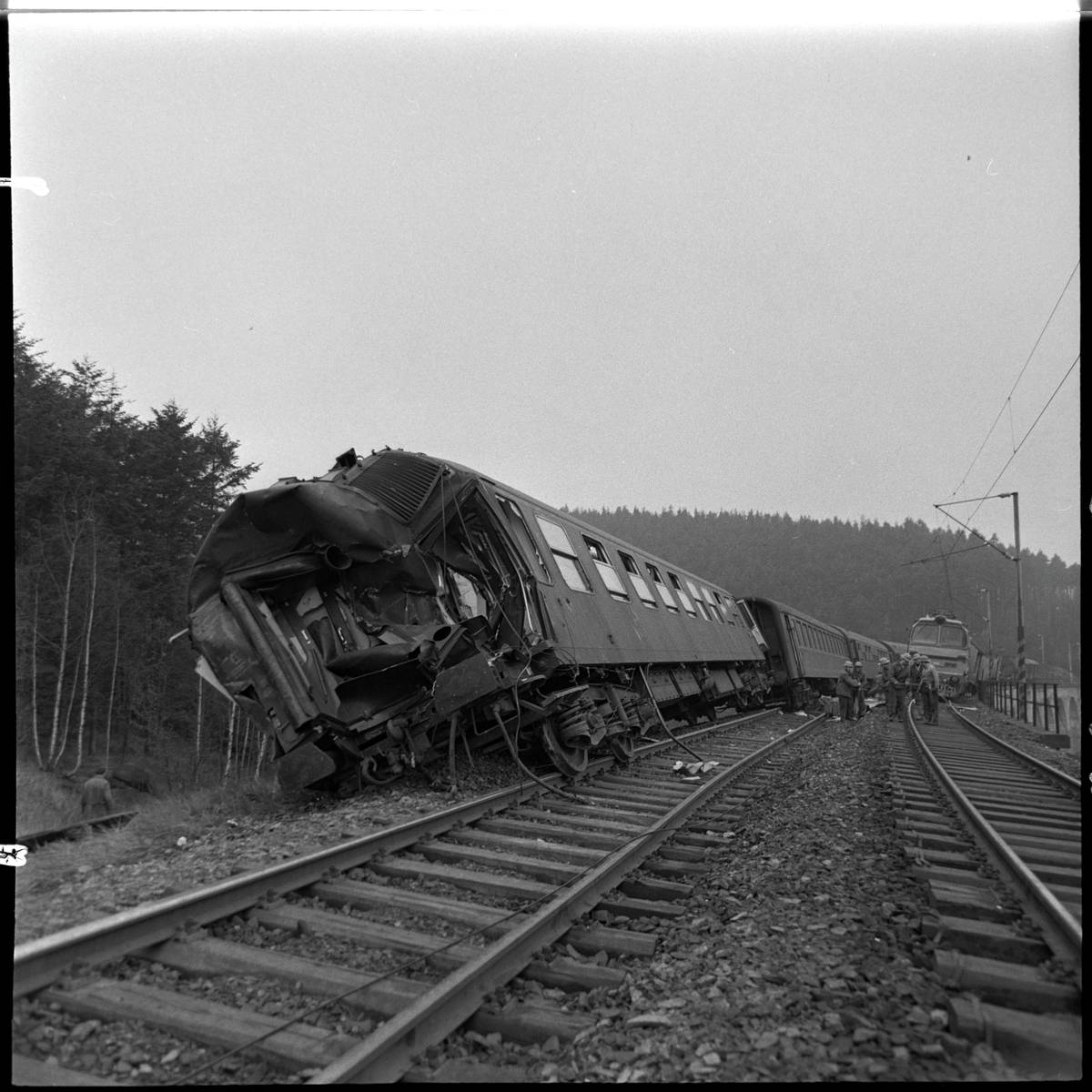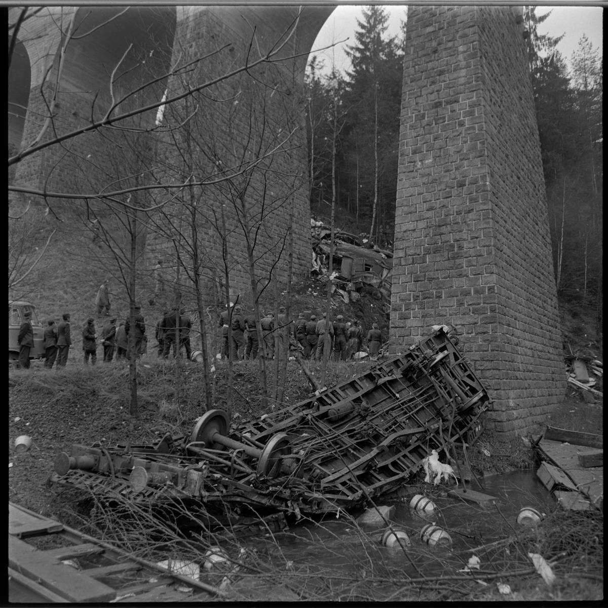 Pohled na sražený nákladní vagon, který spadl z mostu do údolí, v pozadí jeden z rychlíkových vagonů.