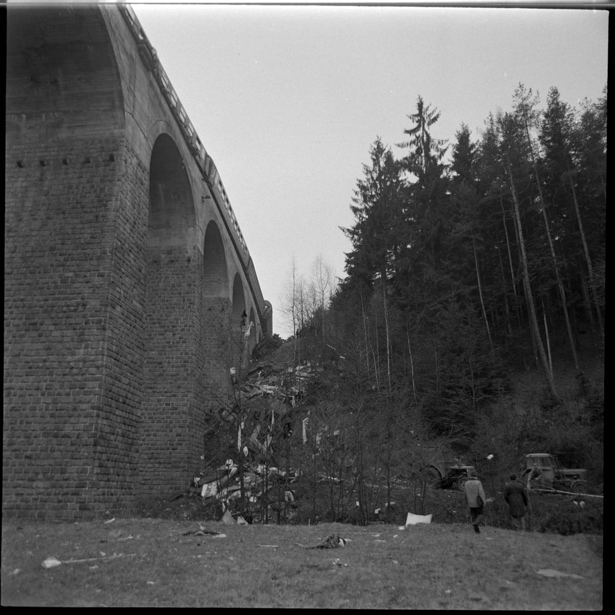 Bylo usmrceno 31 osob, zraněni byli další cestující i zaměstnanci ČSD. Pohled na místo katastrofy na mostě za Řikonínem.