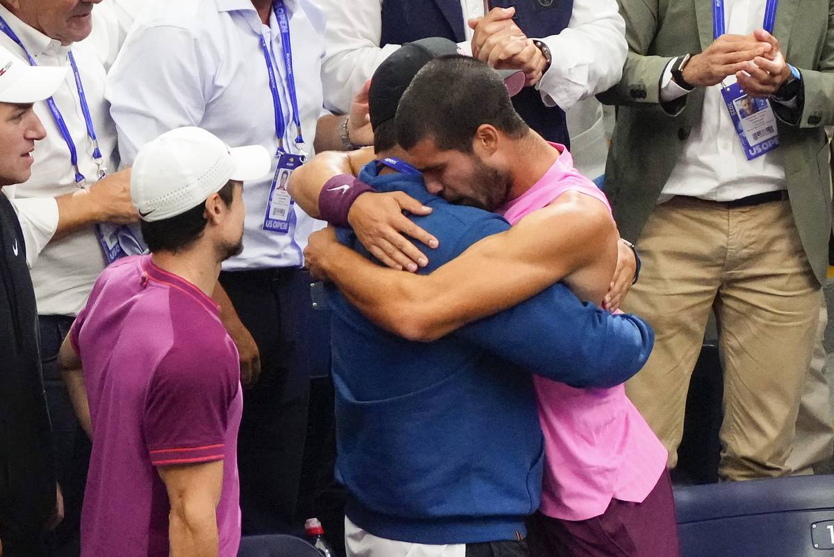 Carlos Alcaraz se objímá se členy svého týmu.